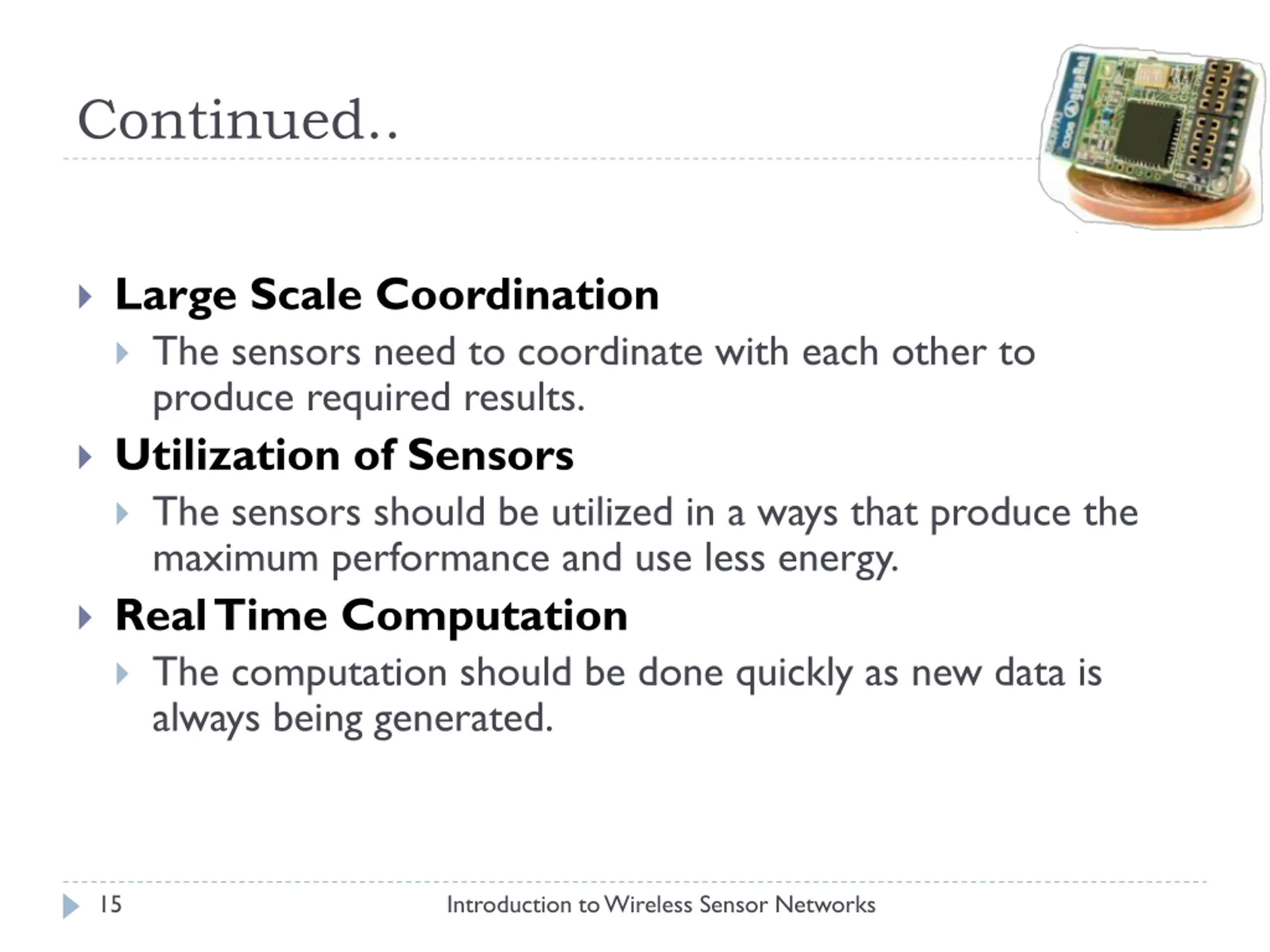 Continued.. Large Scale Coordination The sensors need to coordinate with each other to produce required results. Utilization of Sensors The sensors should be utilized in a ways that produce the maximum performance and use less energy. Real Time Computation The computation should be done quickly as new data is always being generated. 15 Introduction to Wireless Sensor Networks
