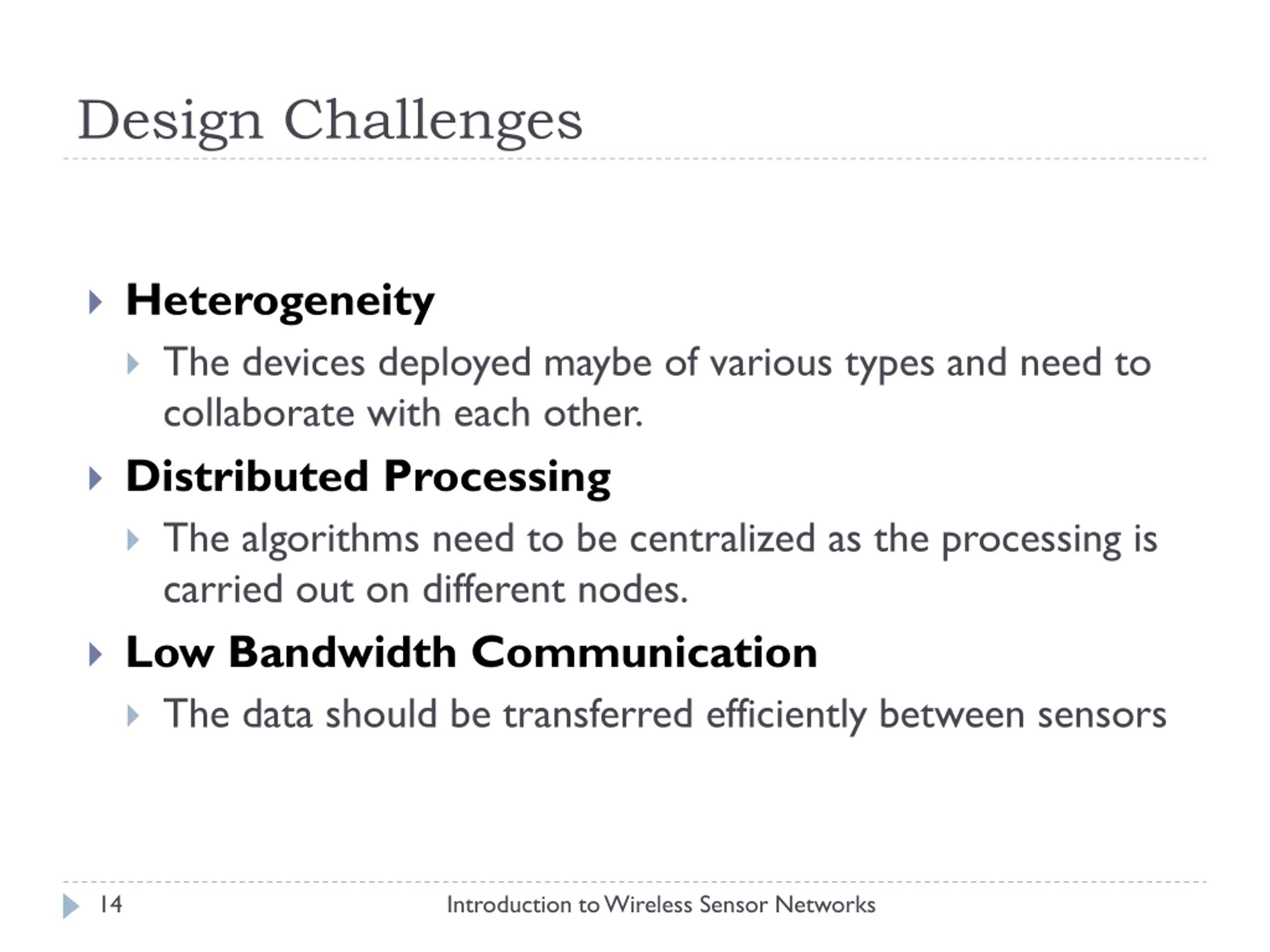 Design Challenges Heterogeneity The devices deployed maybe of various types and need to collaborate with each other. Distributed Processing The algorithms need to be centralized as the processing is carried out on different nodes. Low Bandwidth Communication The data should be transferred efficiently between sensors 14 Introduction to Wireless Sensor Networks
