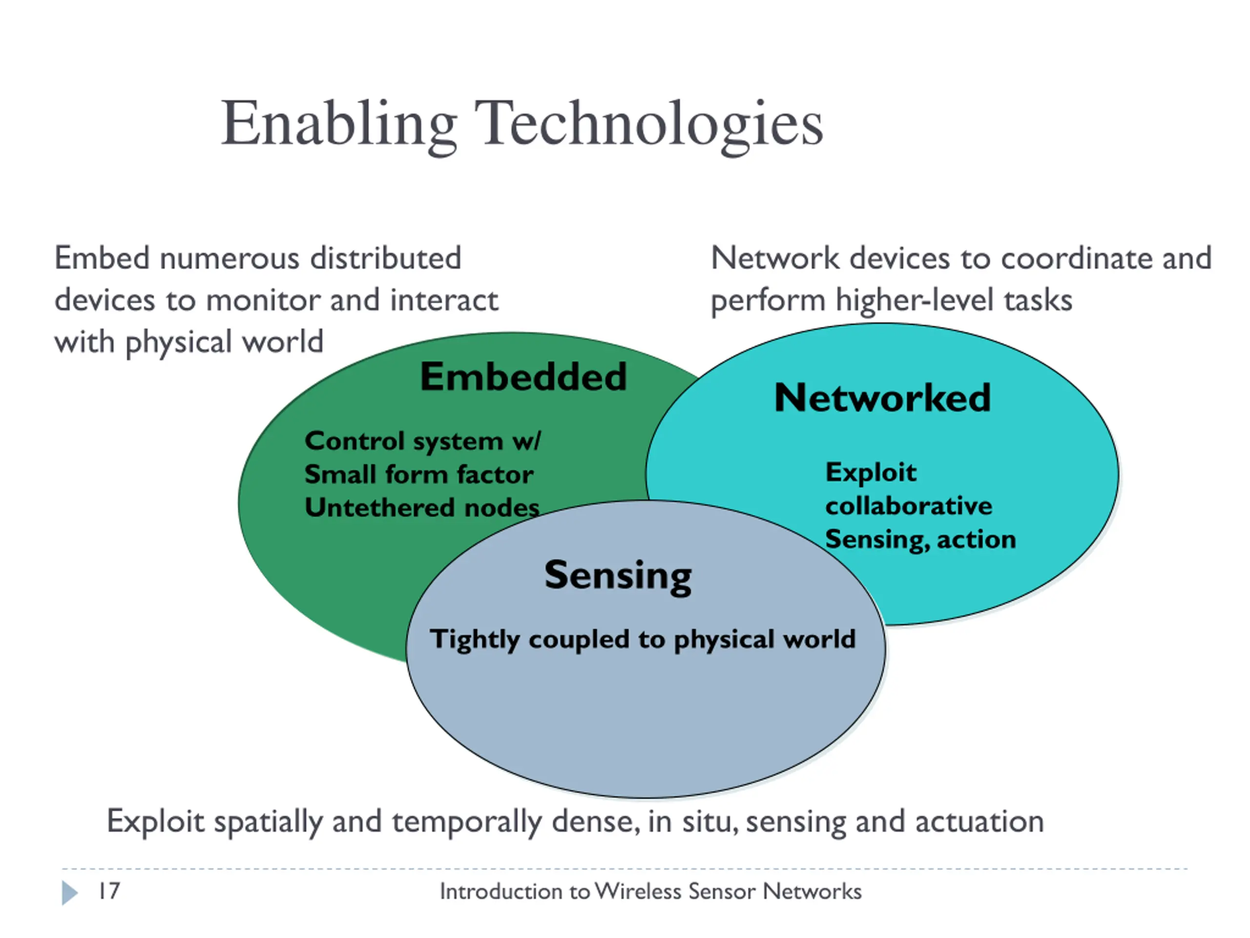 Enabling Technologies Embed numerous distributed devices to monitor and interact with physical world Network devices to coordinate and perform higher-level tasks Embedded Networked Control system w/ Small form factor Untethered nodes Exploit collaborative Sensing, action Sensing Tightly coupled to physical world Exploit spatially and temporally dense, in situ, sensing and actuation 17 Introduction to Wireless Sensor Networks