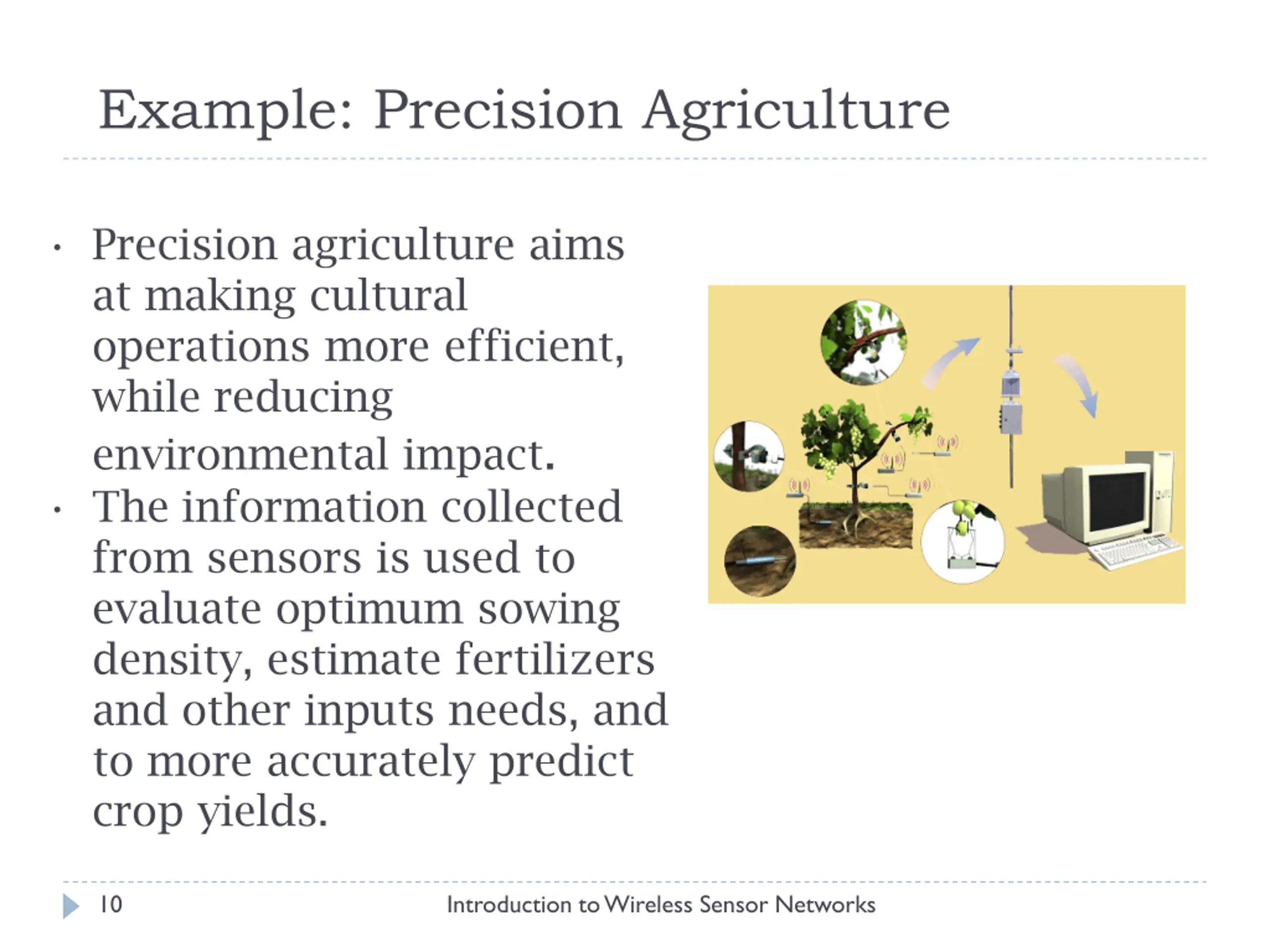 Example: Precision Agriculture Precision agriculture aims at making cultural operations more efficient, while reducing environmental impact. The information collected from sensors is used to evaluate optimum sowing density, estimate fertilizers and other inputs needs, and to more accurately predict crop yields. 10 Introduction to Wireless Sensor Networks
