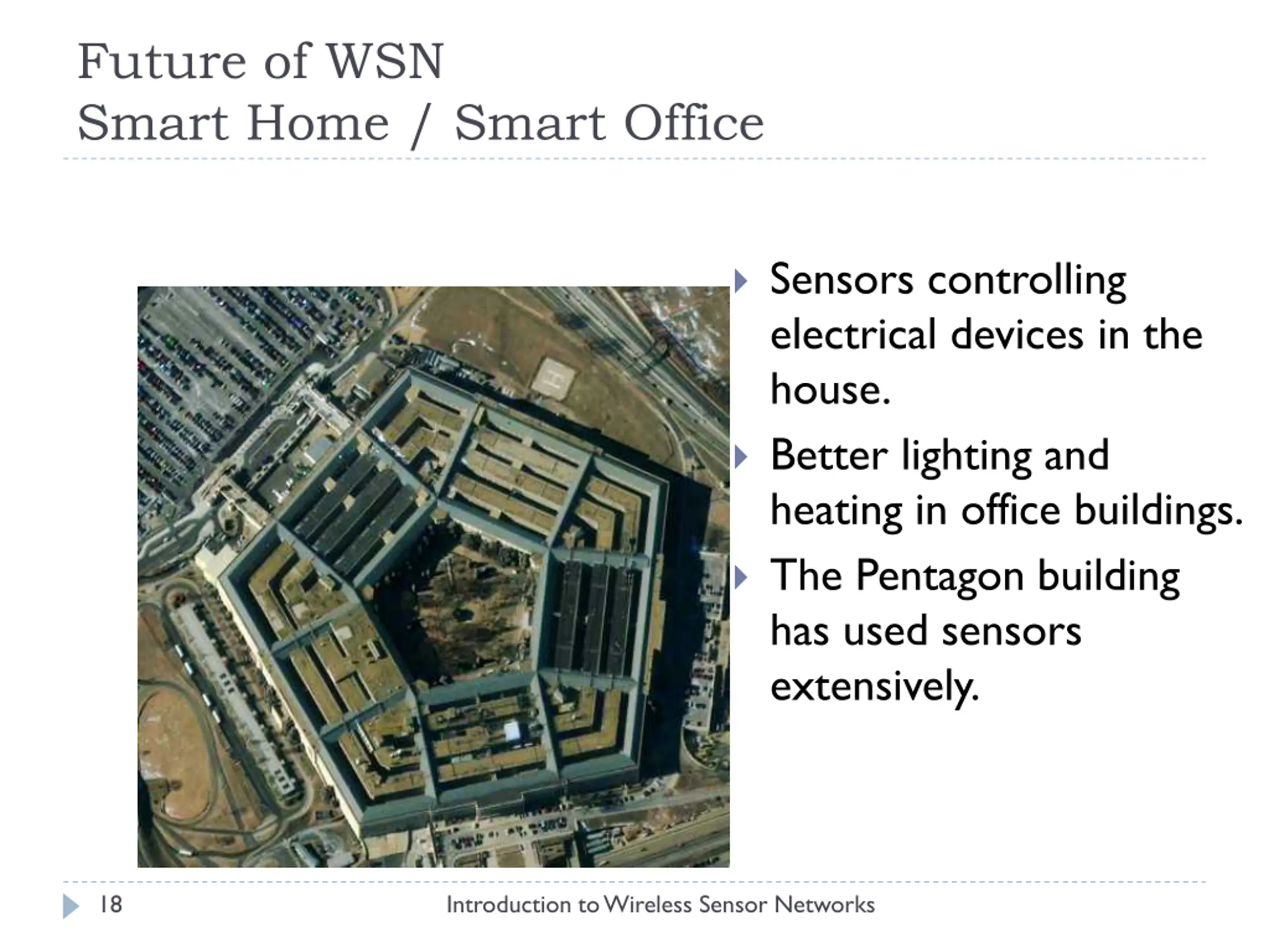Future of WSN Smart Home / Smart Office Sensors controlling electrical devices in the house. Better lighting and heating in office buildings. The Pentagon building has used sensors extensively. 18 Introduction to Wireless Sensor Networks
