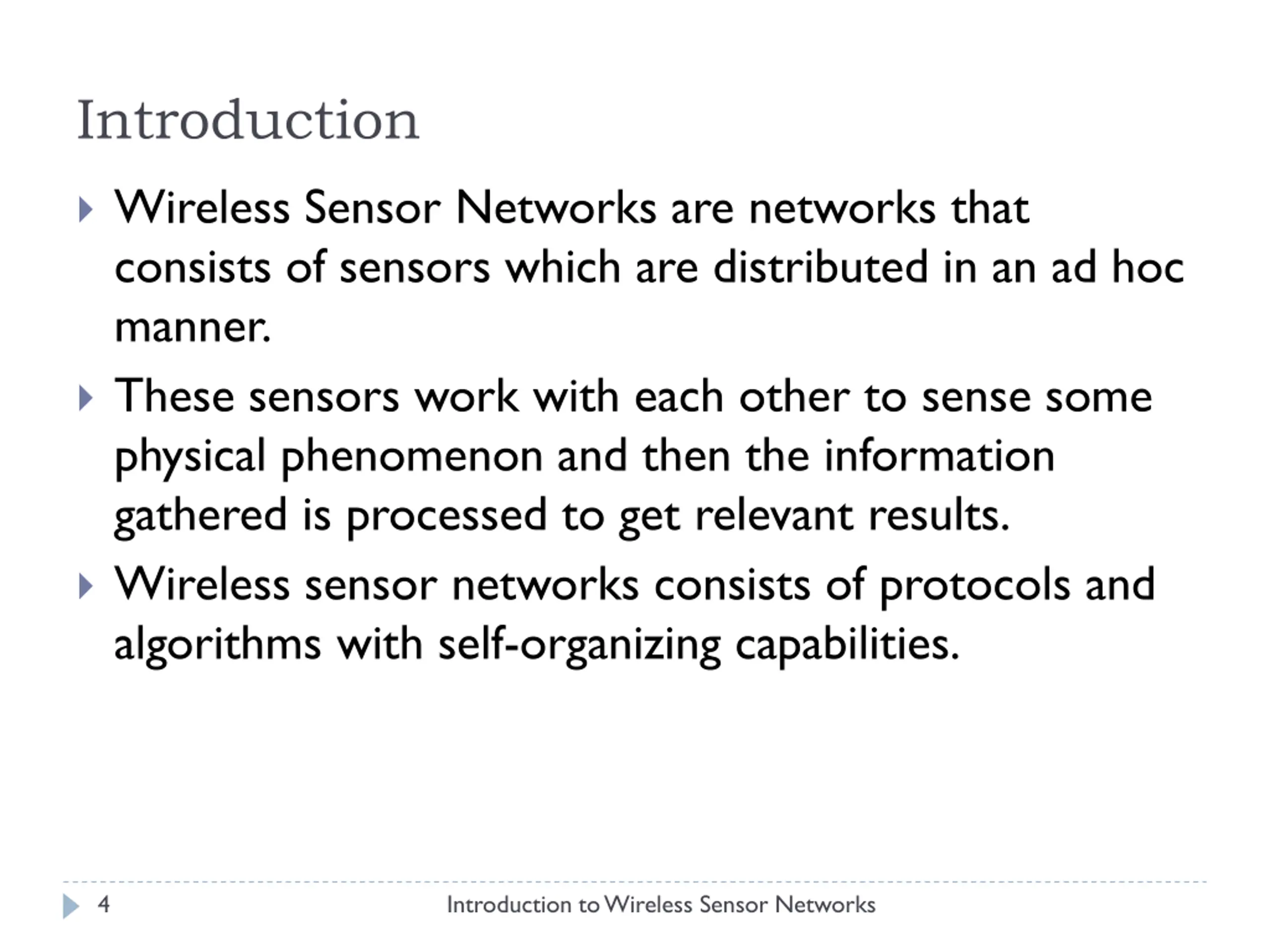Introduction Wireless Sensor Networks are networks that consists of sensors which are distributed in an ad hoc manner. These sensors work with each other to sense some physical phenomenon and then the information gathered is processed to get relevant results. Wireless sensor networks consists of protocols and algorithms with self-organizing capabilities. 4 Introduction to Wireless Sensor Networks