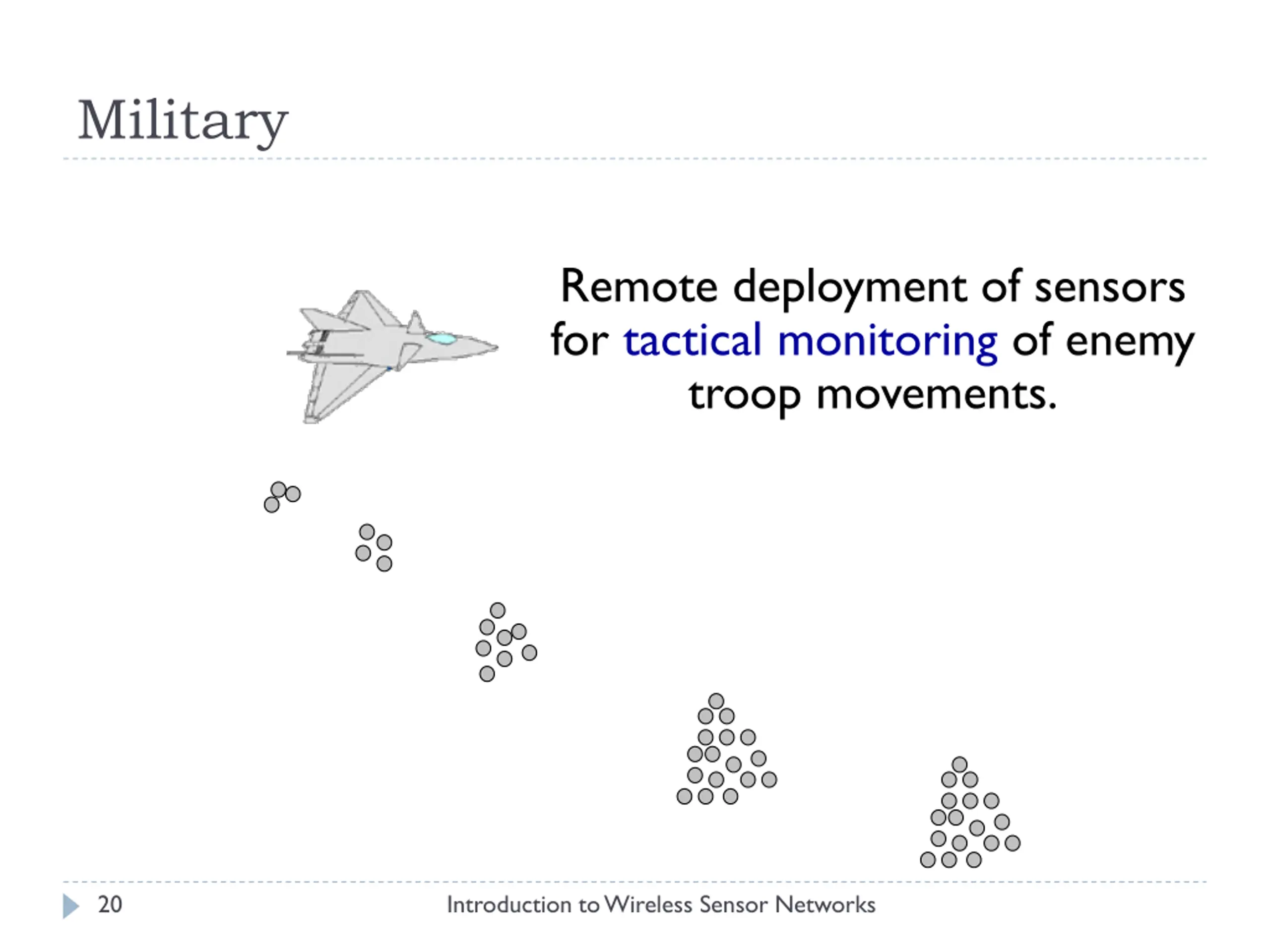 Military Remote deployment of sensors for tactical monitoring of enemy troop movements. 20 Introduction to Wireless Sensor Networks