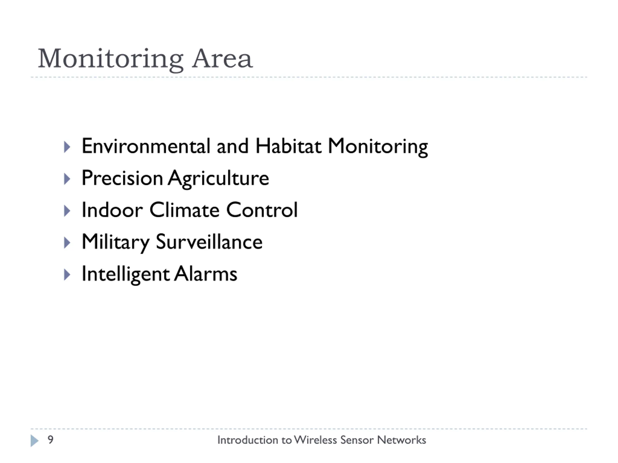 Monitoring Area Environmental and Habitat Monitoring Precision Agriculture Indoor Climate Control Military Surveillance Intelligent Alarms 9 Introduction to Wireless Sensor Networks