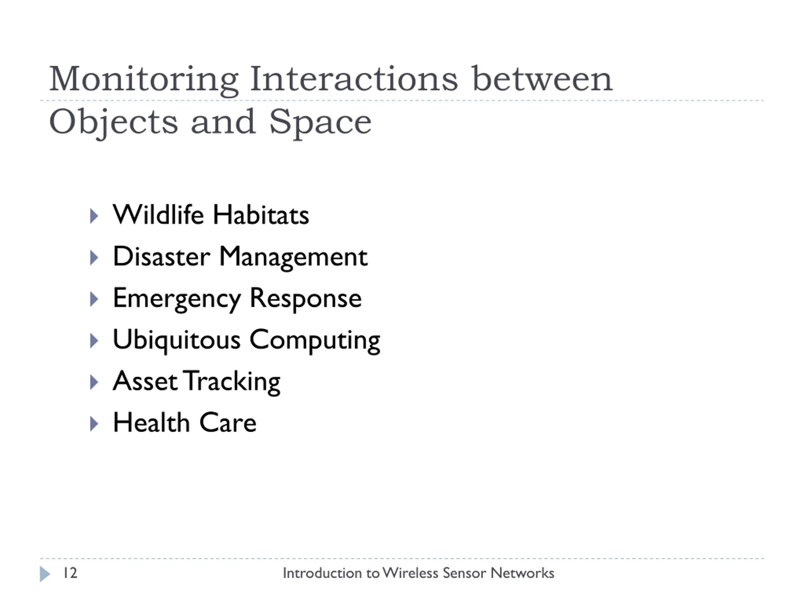 Monitoring Interactions between Objects and Space Wildlife Habitats Disaster Management Emergency Response Ubiquitous Computing Asset Tracking Health Care 12 Introduction to Wireless Sensor Networks