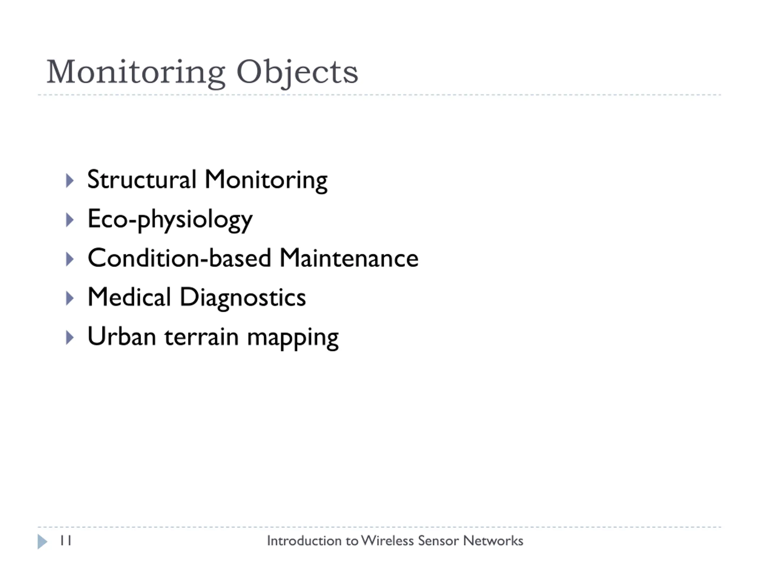 Monitoring Objects Structural Monitoring Eco-physiology Condition-based Maintenance Medical Diagnostics Urban terrain mapping 11 Introduction to Wireless Sensor Networks