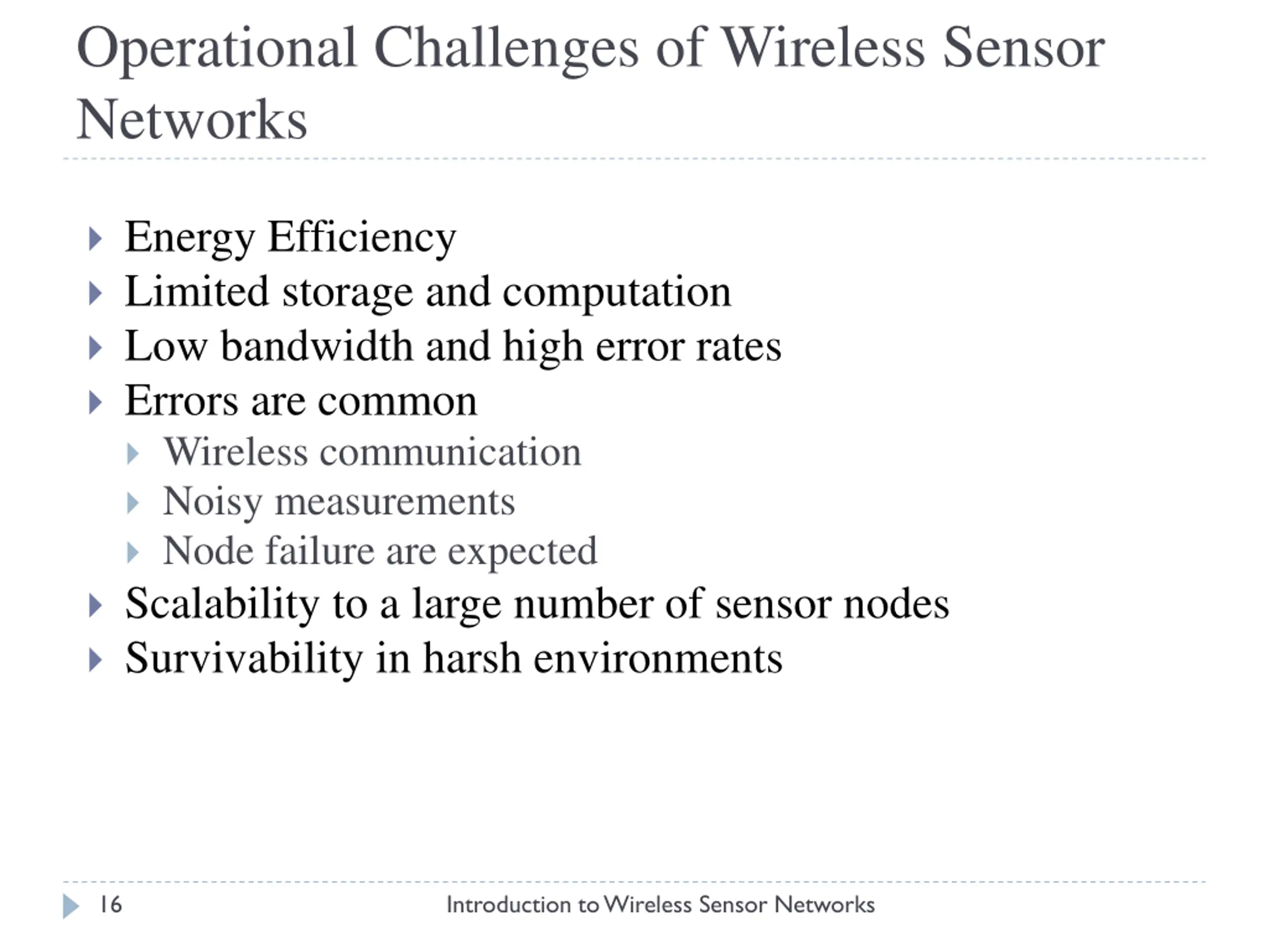 Operational Challenges of Wireless Sensor Networks Energy Efficiency Limited storage and computation Low bandwidth and high error rates Errors are common Wireless communication Noisy measurements Node failure are expected Scalability to a large number of sensor nodes Survivability in harsh environments 16 Introduction to Wireless Sensor Networks