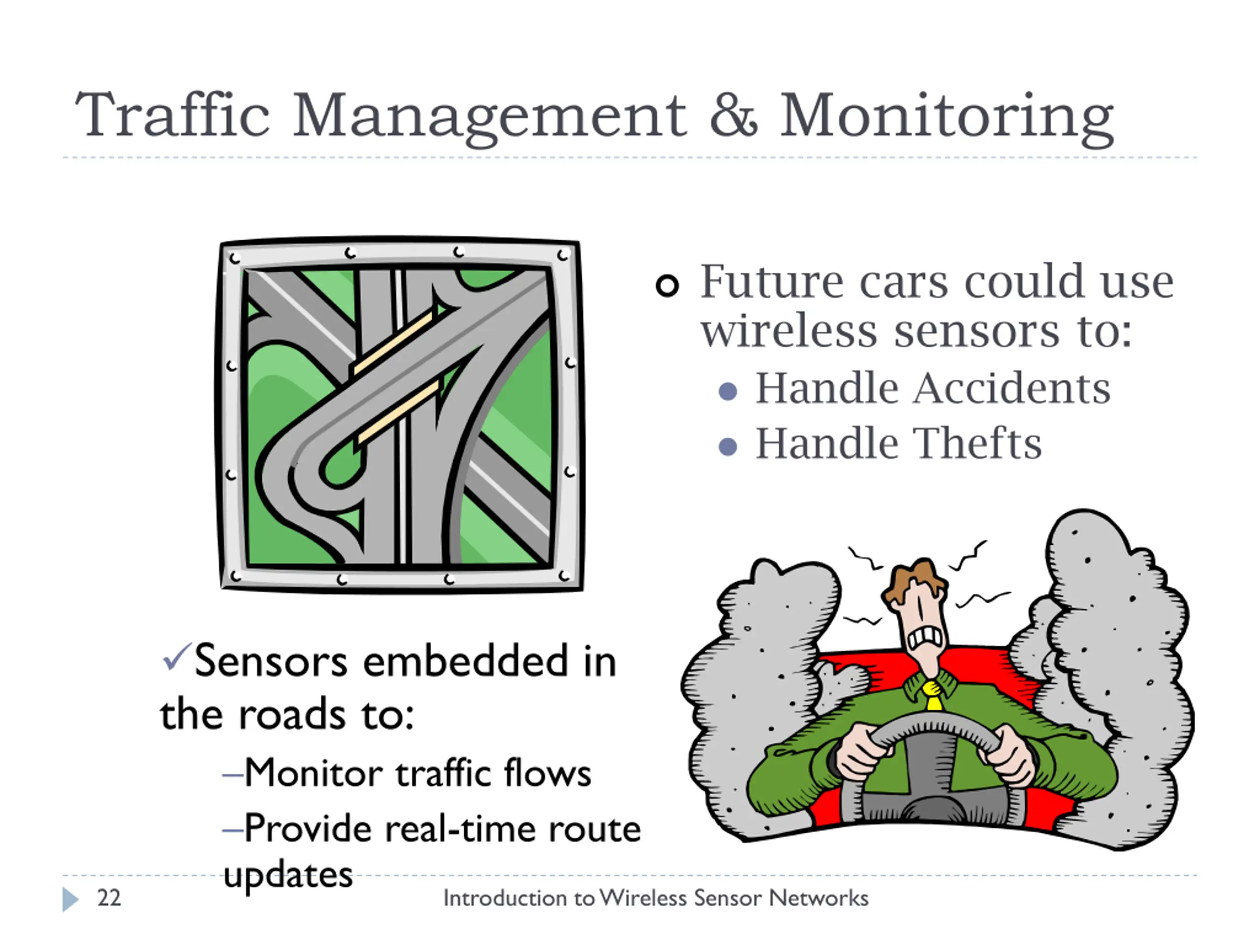Traffic Management & Monitoring Future cars could use wireless sensors to: Handle Accidents Handle Thefts Sensors embedded in the roads to: Monitor traffic flows Provide real-time route updates 22 Introduction to Wireless Sensor Networks
