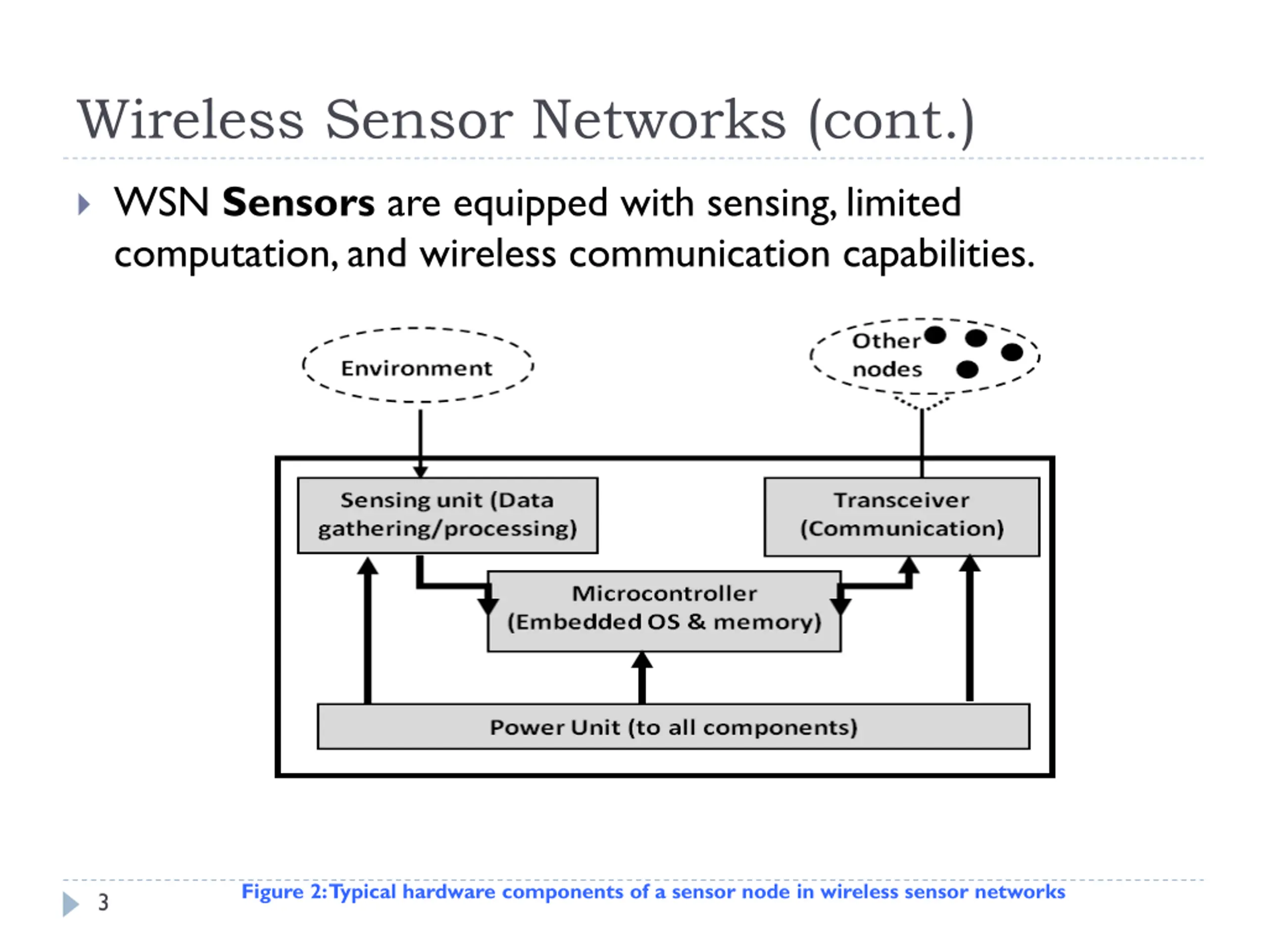 Wireless Sensor Networks (cont.) WSN Sensors are equipped with sensing, limited computation, and wireless communication capabilities. Figure 2: Typical hardware components of a sensor node in wireless sensor networks 3
