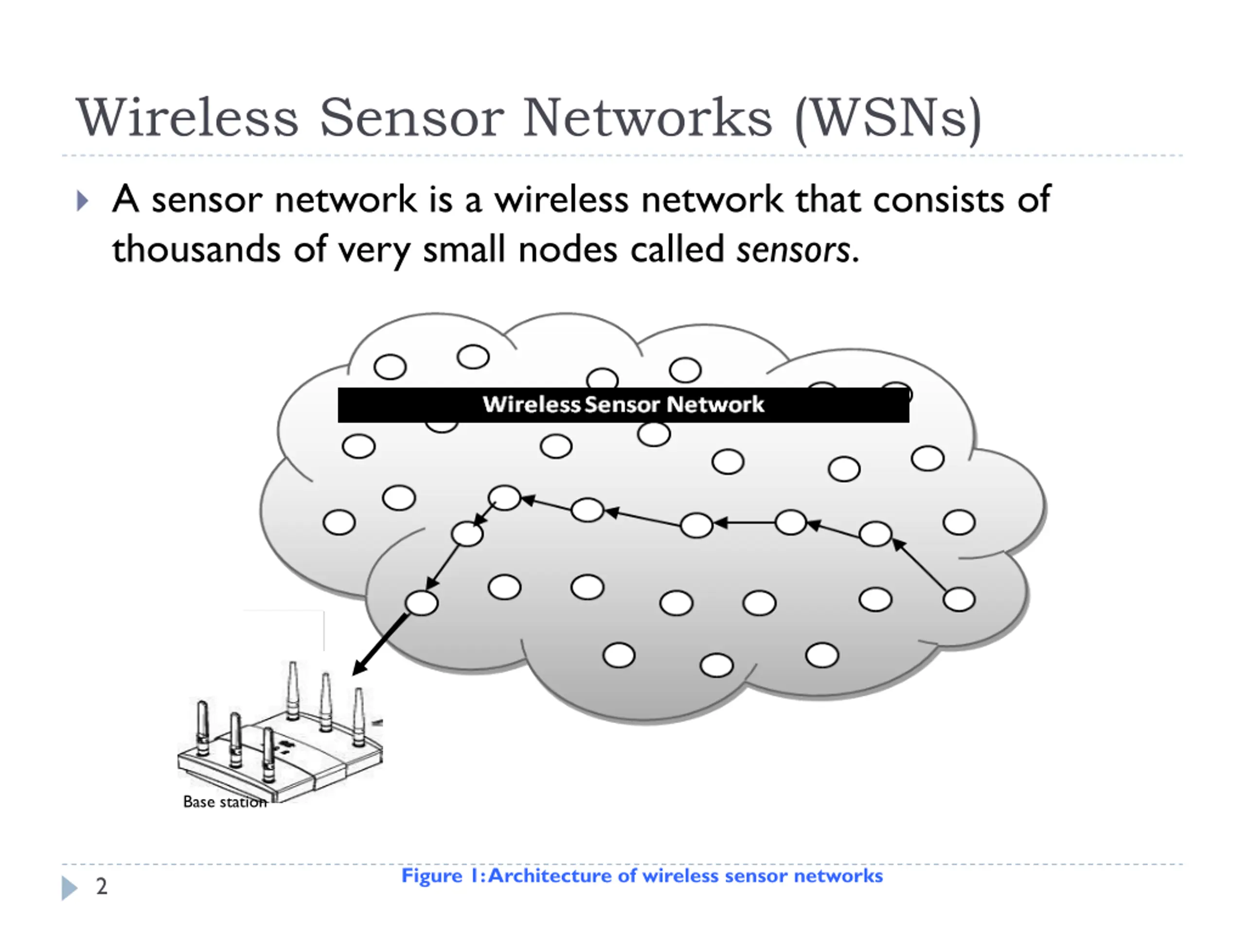 Wireless Sensor Networks (WSNs) A sensor network is a wireless network that consists of thousands of very small nodes called sensors. Base station Figure 1: Architecture of wireless sensor networks 2
