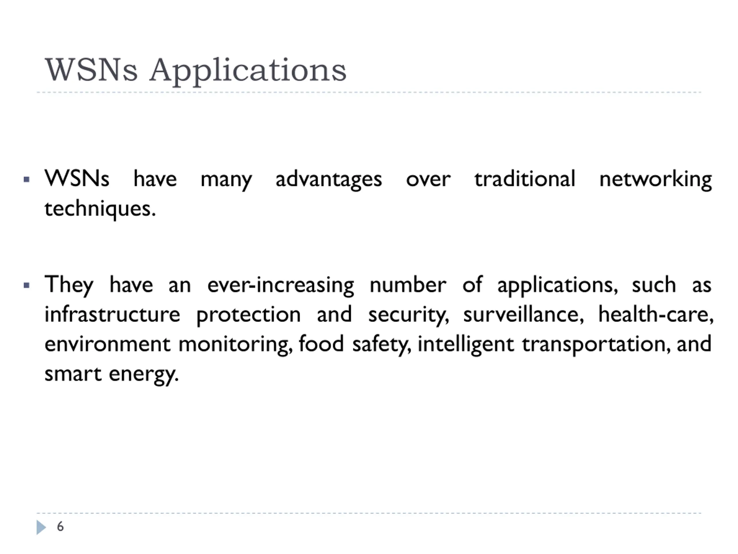 WSNs Applications WSNs have many advantages over traditional networking techniques. They have an ever-increasing number of applications, such as infrastructure protection and security, surveillance, health-care, environment monitoring, food safety, intelligent transportation, and smart energy. 6