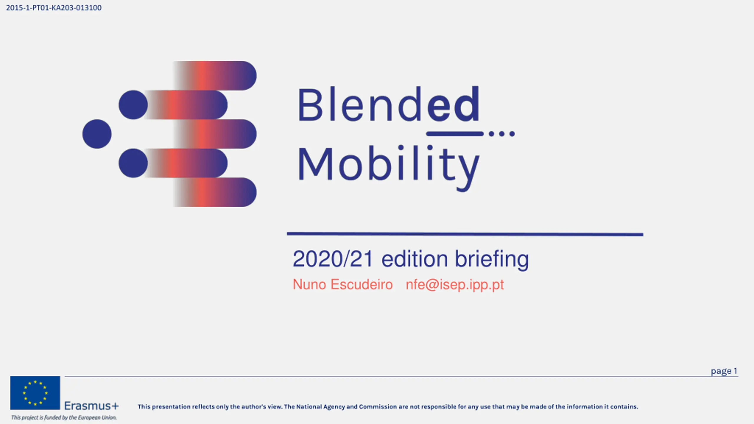 2015-1-PT01-KA203-013100 2020/21 edition briefing Nuno Escudeiro nfe@isep.ipp.pt page 1 This presentation reflects only the author's view. The National Agency and Commission are not responsible for any use that may be made of the information it contains.