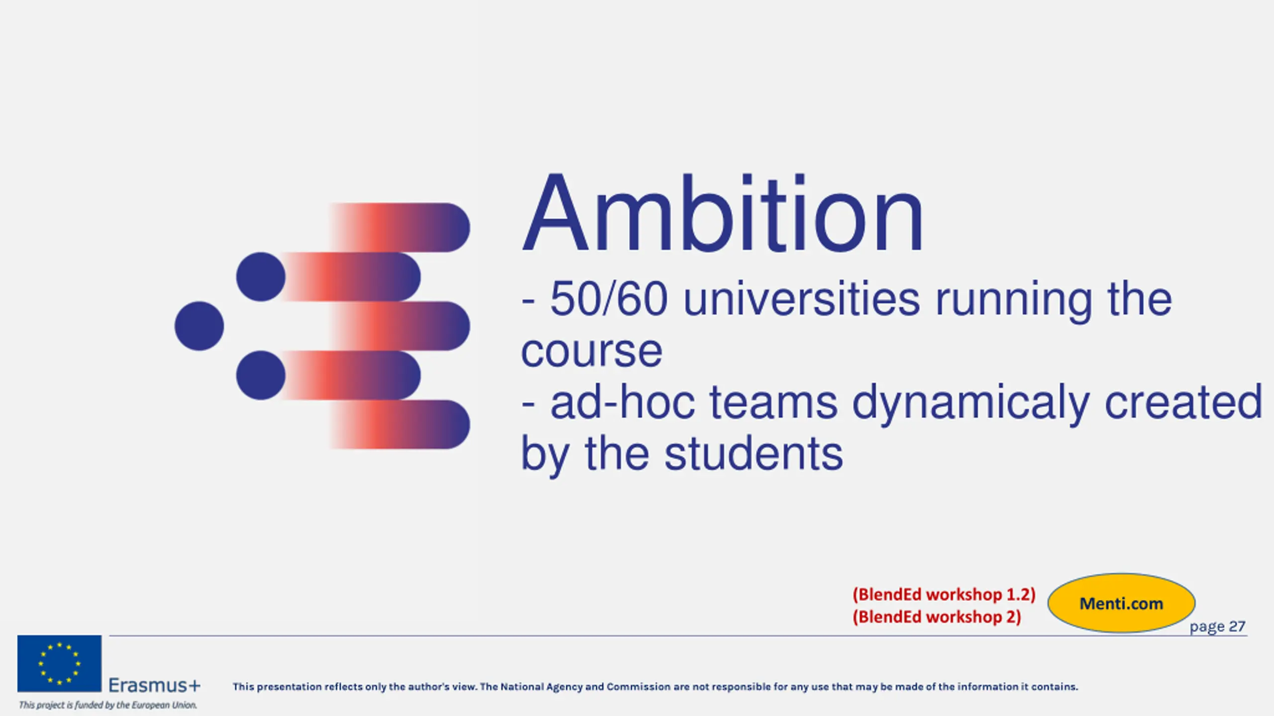 Ambition - 50/60 universities running the course - ad-hoc teams dynamicaly created by the students (BlendEd workshop 1.2) (BlendEd workshop 2) Menti.com page 27 This presentation reflects only the author's view. The National Agency and Commission are not responsible for any use that may be made of the information it contains.