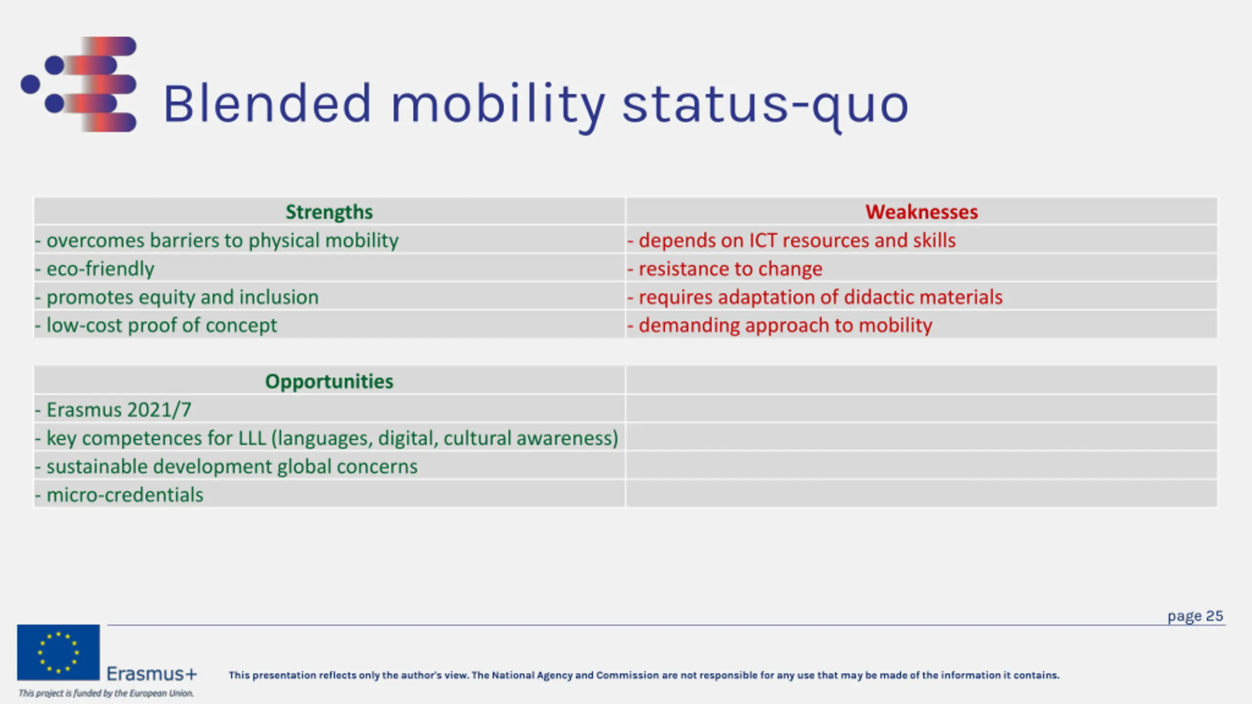 Blended mobility status-quo Strengths - overcomes barriers to physical mobility - eco-friendly - promotes equity and inclusion - low-cost proof of concept page 23 This presentation reflects only the author's view. The National Agency and Commission are not responsible for any use that may be made of the information it contains.