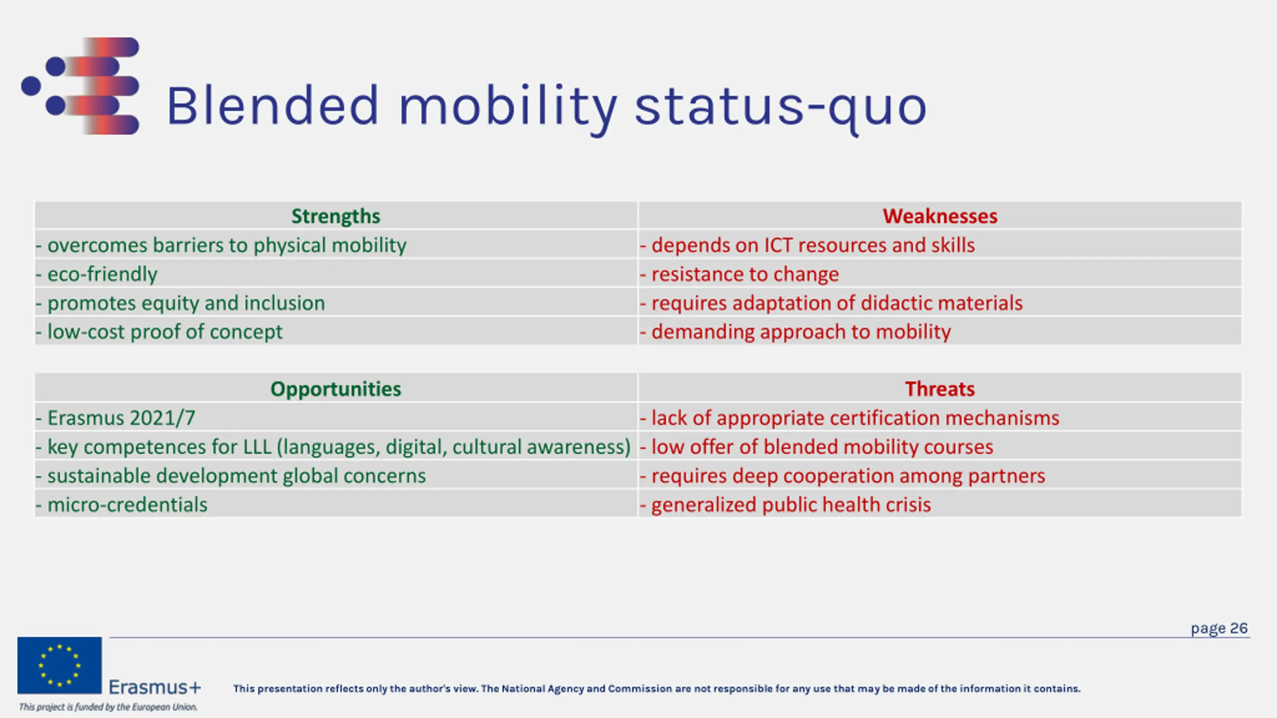 Blended mobility status-quo Strengths Weaknesses - overcomes barriers to physical mobility - eco-friendly - promotes equity and inclusion - low-cost proof of concept - depends on ICT resources and skills - resistance to change - requires adaptation of didactic materials - demanding approach to mobility Opportunities - Erasmus 2021/7 - key competences for LLL (languages, digital, cultural awareness) - sustainable development global concerns - micro-credentials page 25 This presentation reflects only the author's view. The National Agency and Commission are not responsible for any use that may be made of the information it contains.