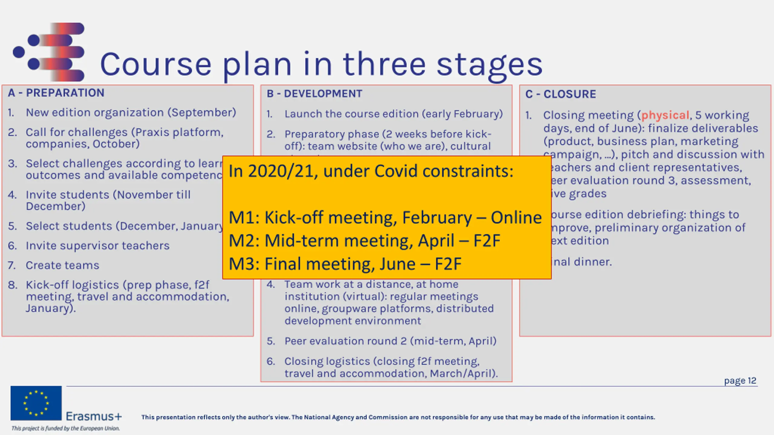 Course plan in three stages A - PREPARATION 1. New edition organization (September) 2. Call for challenges (Praxis platform, companies, October) 3. Select challenges according to learning outcomes and available competences 4. Invite students (November till December) 5. Select students (December, January) 6. Invite supervisor teachers 7. Create teams 8. Kick-off logistics (prep phase, f2f meeting, travel and accommodation, January). C - CLOSURE B - DEVELOPMENT 1. Launch the course edition (early February) 1. Closing meeting (physical, 5 working days, end of June): finalize deliverables (product, business plan, marketing campaign, ...), pitch and discussion with teachers and client representatives, peer evaluation round 3, assessment, give grades 2. Preparatory phase (2 weeks before kick- off): team website (who we are), cultural stereotypes In 2020/21, under Covid constraints: 3. Kick-off meeting (physical, 5 working days, end of February): team building, know the client and the challenge, know the team, know the ECTS-budget, organize work and tools, seminars / workshops (agile development, intercultural team work, ...), pitch and discuss proposal with the client, peer evaluation round 1 M3: Final meeting, June F2F 2. Course edition debriefing: things to improve, preliminary organization of next edition M1: Kick-off meeting, February Online M2: Mid-term meeting, April F2F 3. Final dinner. 4. Team work at a distance, at home institution (virtual): regular meetings online, groupware platforms, distributed development environment 5. Peer evaluation round 2 (mid-term, April) 6. Closing logistics (closing f2f meeting, travel and accommodation, March/April). page 12 This presentation reflects only the author's view. The National Agency and Commission are not responsible for any use that may be made of the information it contains.