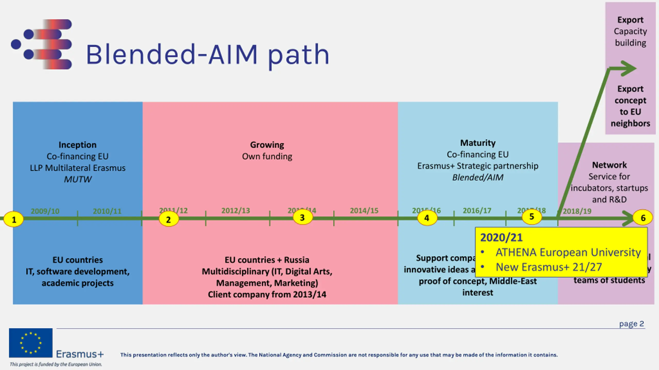 Export Capacity building Blended-AIM path Export concept to EU neighbors Maturity Co-financing EU Erasmus+ Strategic partnership Blended/AIM Inception Co-financing EU LLP Multilateral Erasmus MUTW Growing Own funding Network Service for incubators, startups and R&D 2011/12 2 2012/13 2013/14 3 2014/15 2015/16 4 2016/17 2017/18 5 2009/10 2010/11 2018/19 6 1 2020/21 ATHENA European University New Erasmus+ 21/27 Ad-hoc International and multidisciplinary teams of students Support companies developing innovative ideas at low cost, low cost proof of concept, Middle-East interest EU countries EU countries + Russia Multidisciplinary (IT, Digital Arts, Management, Marketing) Client company from 2013/14 IT, software development, academic projects page 2 This presentation reflects only the author's view. The National Agency and Commission are not responsible for any use that may be made of the information it contains.