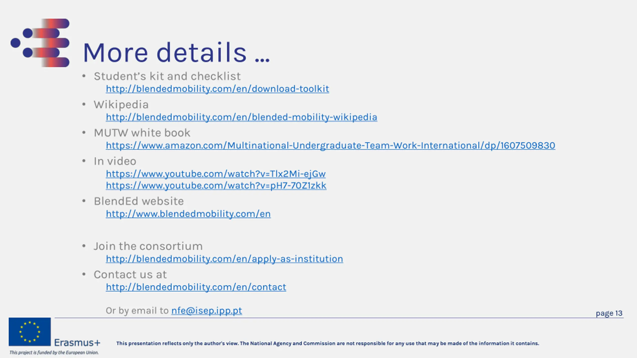 More details ... Student s kit and checklist http://blendedmobility.com/en/download-toolkit Wikipedia http://blendedmobility.com/en/blended-mobility-wikipedia MUTW white book https://www.amazon.com/Multinational-Undergraduate-Team-Work-International/dp/1607509830 In video https://www.youtube.com/watch?v=Tlx2Mi-ejGw https://www.youtube.com/watch?v=pH7-70Z1zkk BlendEd website http://www.blendedmobility.com/en Join the consortium http://blendedmobility.com/en/apply-as-institution Contact us at http://blendedmobility.com/en/contact Or by email to nfe@isep.ipp.pt page 13 This presentation reflects only the author's view. The National Agency and Commission are not responsible for any use that may be made of the information it contains.
