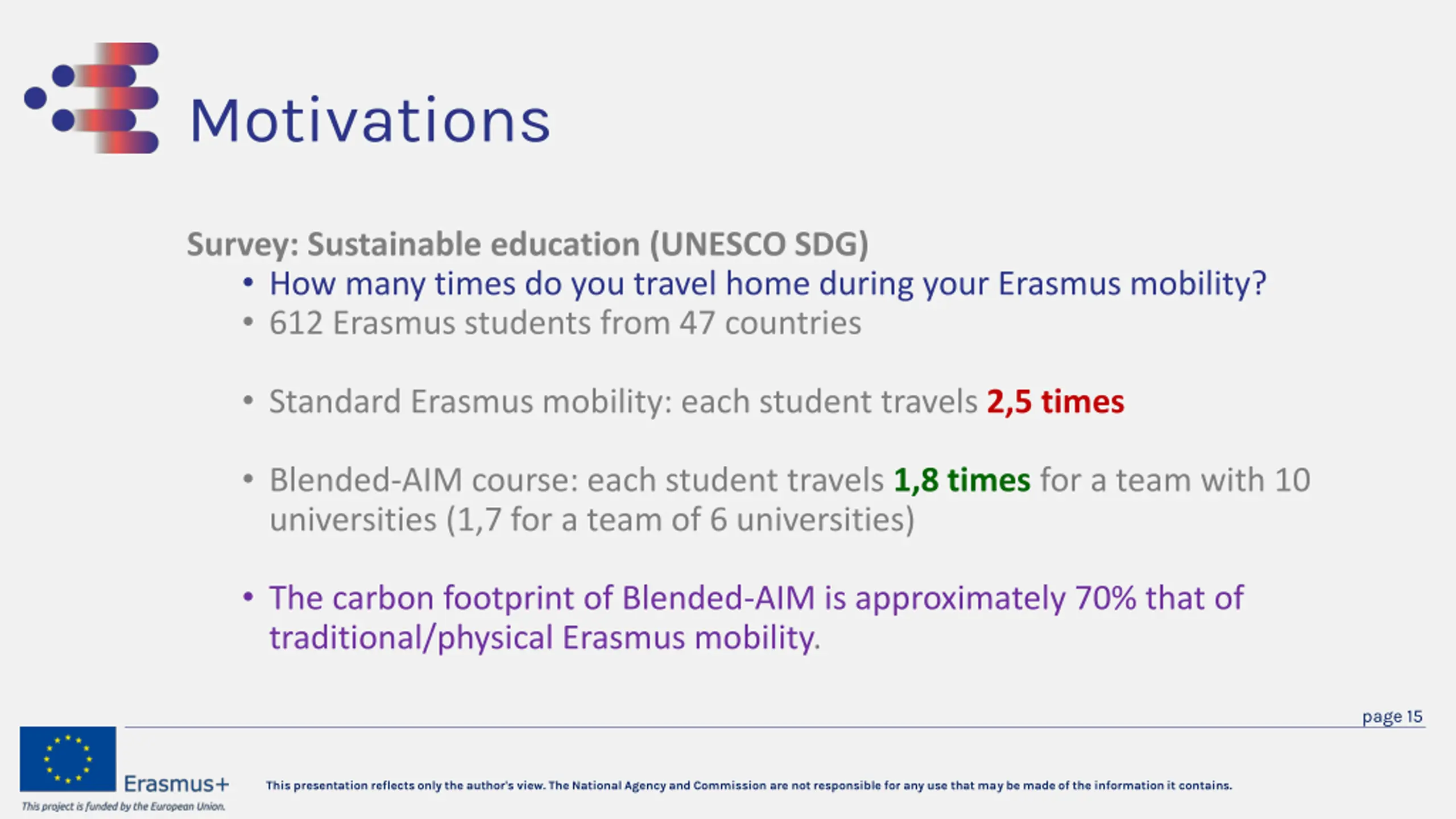 Motivations Survey: Sustainable education (UNESCO SDG) How many times do you travel home during your Erasmus mobility? 612 Erasmus students from 47 countries Standard Erasmus mobility: each student travels 2,5 times Blended-AIM course: each student travels 1,8 times for a team with 10 universities (1,7 for a team of 6 universities) The carbon footprint of Blended-AIM is approximately 70% that of traditional/physical Erasmus mobility. page 15 This presentation reflects only the author's view. The National Agency and Commission are not responsible for any use that may be made of the information it contains.