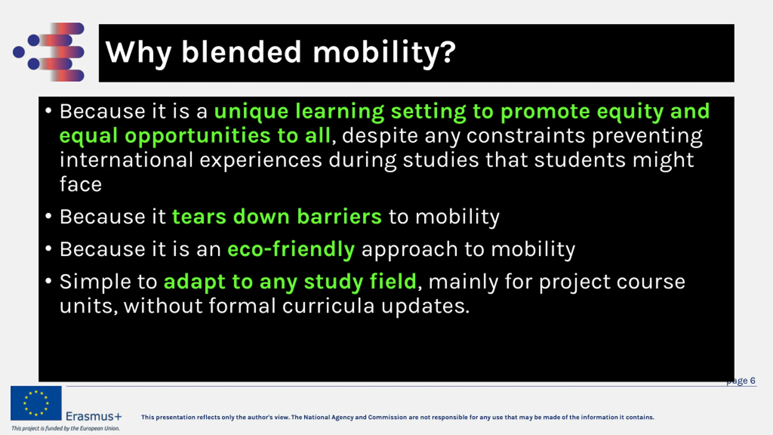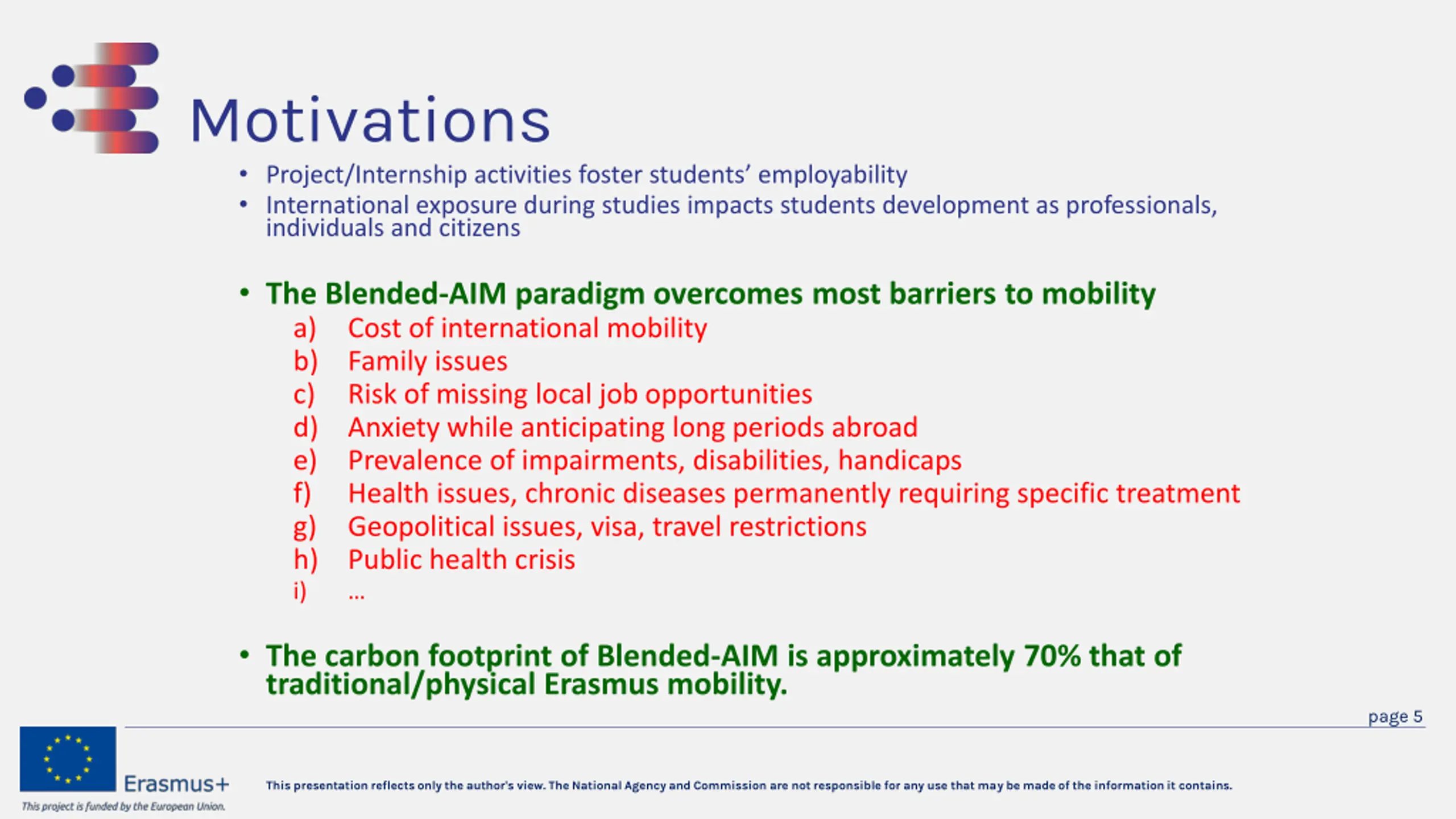 Motivations Project/Internship activities foster students employability International exposure during studies impacts students development as professionals, individuals and citizens The Blended-AIM paradigm overcomes most barriers to mobility a) Cost of international mobility b) Family issues c) Risk of missing local job opportunities d) Anxiety while anticipating long periods abroad e) Prevalence of impairments, disabilities, handicaps f) Health issues, chronic diseases permanently requiring specific treatment g) Geopolitical issues, visa, travel restrictions h) Public health crisis i) The carbon footprint of Blended-AIM is approximately 70% that of traditional/physical Erasmus mobility. page 5 This presentation reflects only the author's view. The National Agency and Commission are not responsible for any use that may be made of the information it contains.