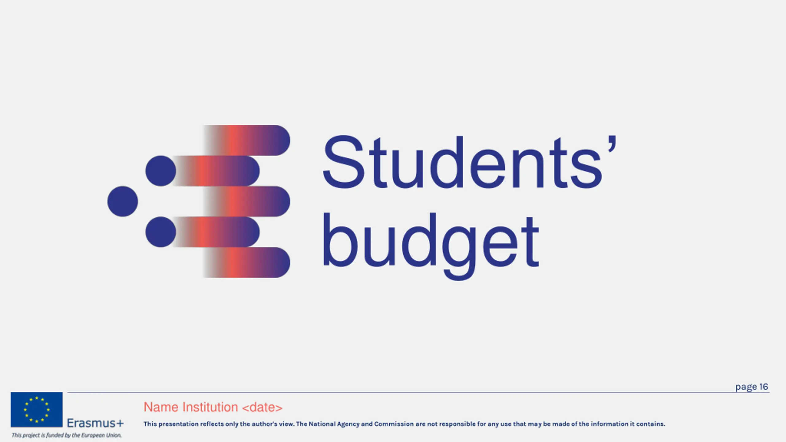 Students budget page 16 Name Institution <date> This presentation reflects only the author's view. The National Agency and Commission are not responsible for any use that may be made of the information it contains.