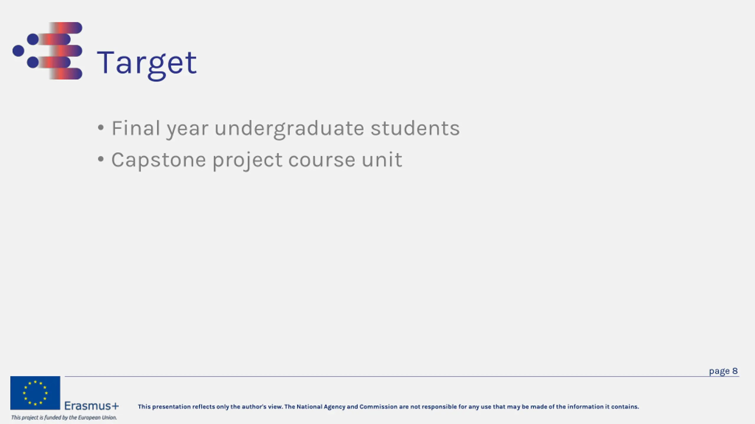 Target Final year undergraduate students Capstone project course unit page 8 This presentation reflects only the author's view. The National Agency and Commission are not responsible for any use that may be made of the information it contains.