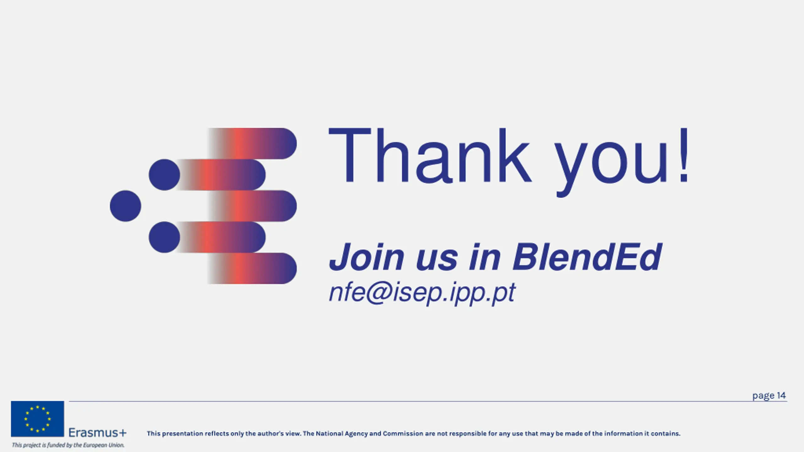 Thank you! Join us in BlendEd nfe@isep.ipp.pt page 14 This presentation reflects only the author's view. The National Agency and Commission are not responsible for any use that may be made of the information it contains.
