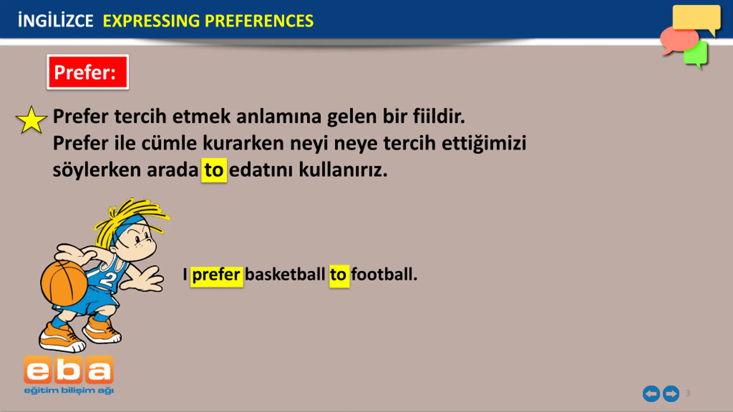 NGLZCE EXPRESSING PREFERENCES Prefer: Prefer tercih etmek anlam na gelen bir fiildir. Prefer ile c mle kurarken neyi neye tercih etti imizi s ylerken arada to edat n kullan r z. I prefer basketball to football. arrow.png arrow.png 3