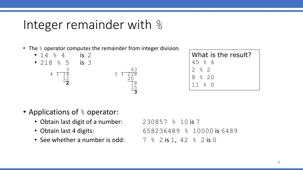Integer division with // When we divide integers with //, the quotient is also an integer. 14 // 4 is 3, not 3.5 3 4 52 4 ) 14 10 ) 45 27 ) 1425 12 40 135 2 5 75 54 21 More examples: 32 // 5 is 6 84 // 10 is 8 156 // 100 is 1 What happens when you divide by 0? 7