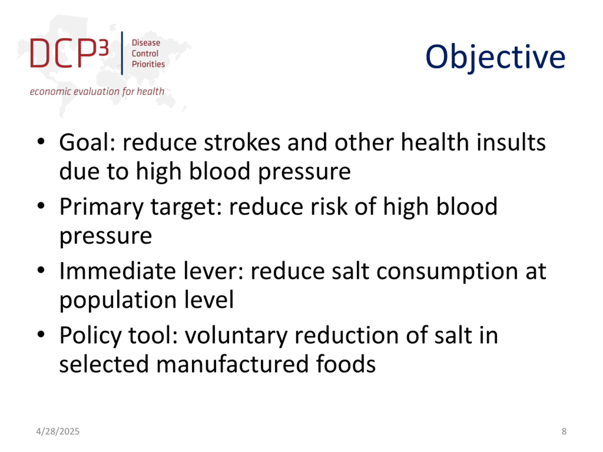 Objective Goal: reduce strokes and other health insults due to high blood pressure Primary target: reduce risk of high blood pressure Immediate lever: reduce salt consumption at population level Policy tool: voluntary reduction of salt in selected manufactured foods 4/28/2025 8