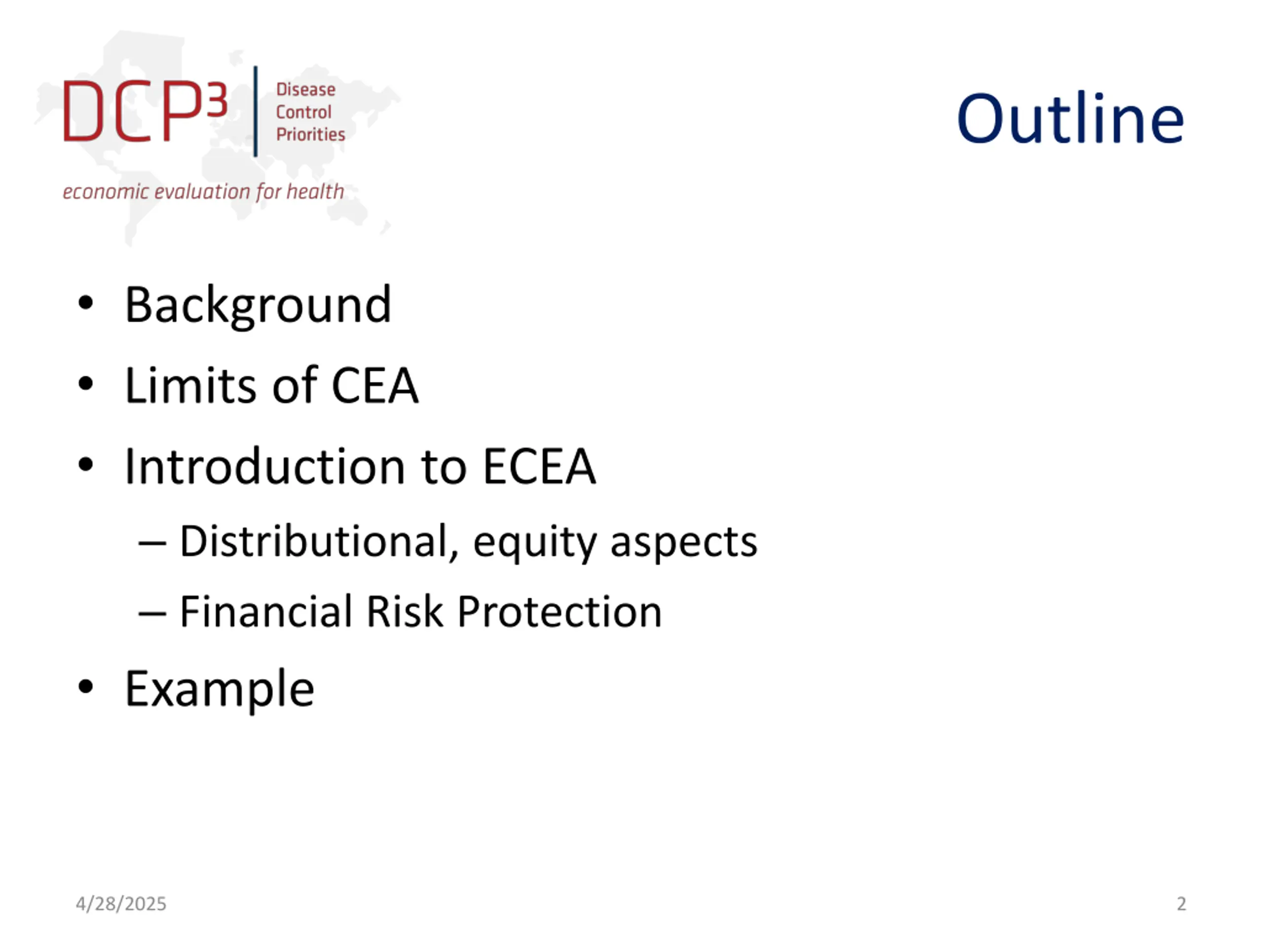 Outline Background Limits of CEA Introduction to ECEA Distributional, equity aspects Financial Risk Protection Example 4/28/2025 2