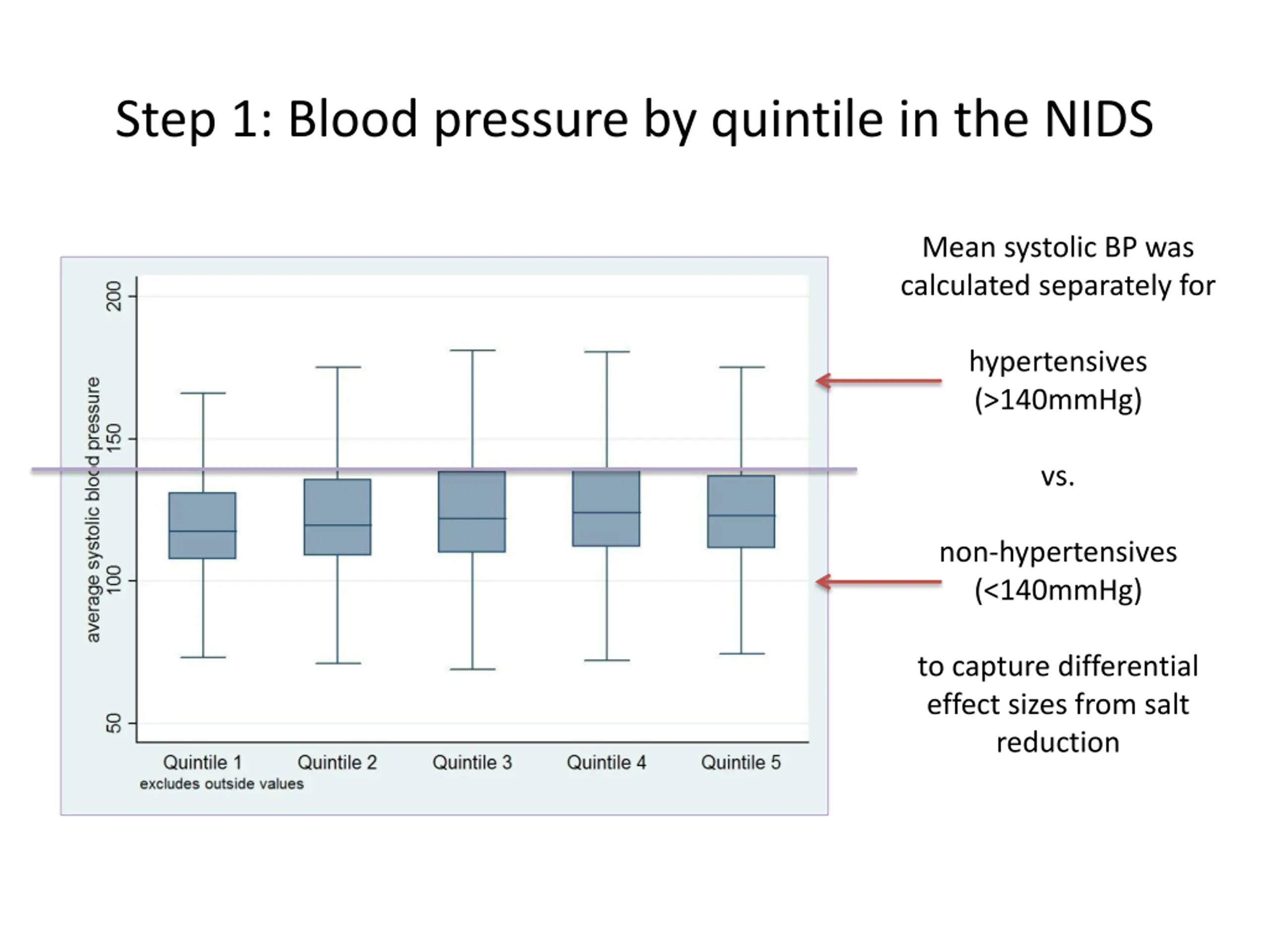 Step 1: Blood pressure by quintile in the NIDS Mean systolic BP was calculated separately for hypertensives (>140mmHg) vs. non-hypertensives (<140mmHg) to capture differential effect sizes from salt reduction
