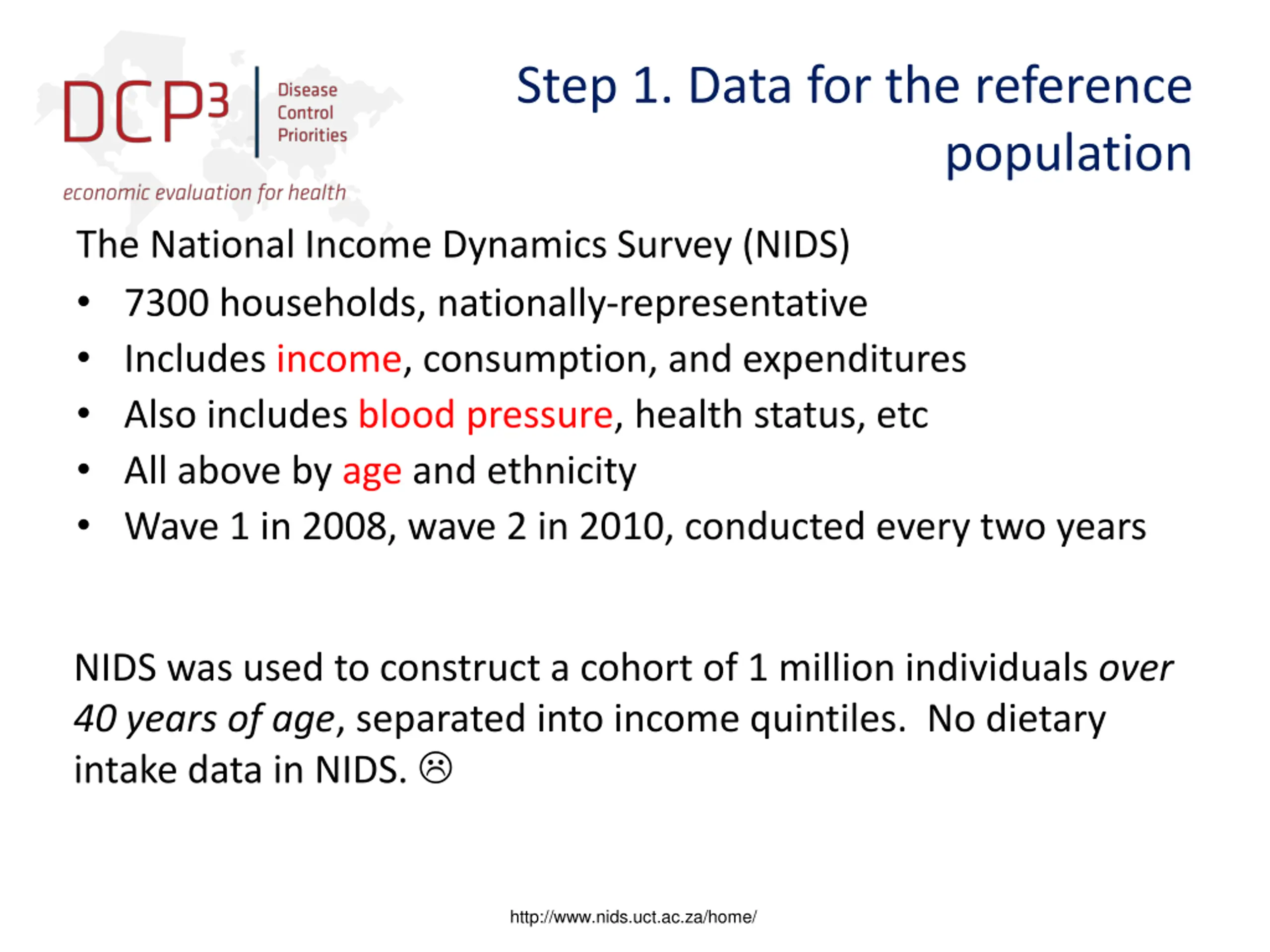 Step 1. Data for the reference population The National Income Dynamics Survey (NIDS) 7300 households, nationally-representative Includes income, consumption, and expenditures Also includes blood pressure, health status, etc All above by age and ethnicity Wave 1 in 2008, wave 2 in 2010, conducted every two years NIDS was used to construct a cohort of 1 million individuals over 40 years of age, separated into income quintiles. No dietary intake data in NIDS. http://www.nids.uct.ac.za/home/