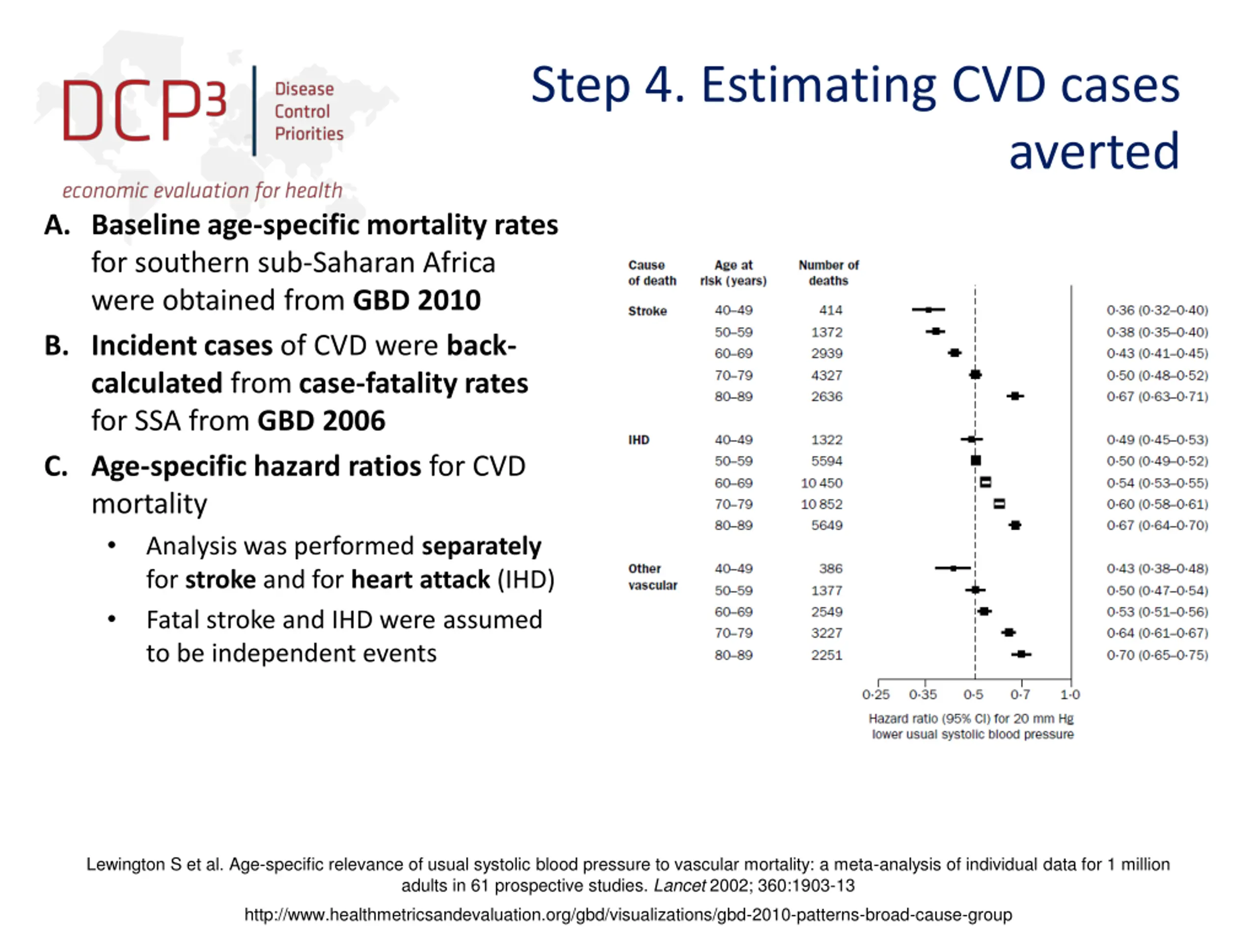 Step 4. Estimating CVD cases averted A. Baseline age-specific mortality rates for southern sub-Saharan Africa were obtained from GBD 2010 B. Incident cases of CVD were back- calculated from case-fatality rates for SSA from GBD 2006 C. Age-specific hazard ratios for CVD mortality Analysis was performed separately for stroke and for heart attack (IHD) Fatal stroke and IHD were assumed to be independent events Lewington S et al. Age-specific relevance of usual systolic blood pressure to vascular mortality: a meta-analysis of individual data for 1 million adults in 61 prospective studies. Lancet 2002; 360:1903-13 http://www.healthmetricsandevaluation.org/gbd/visualizations/gbd-2010-patterns-broad-cause-group