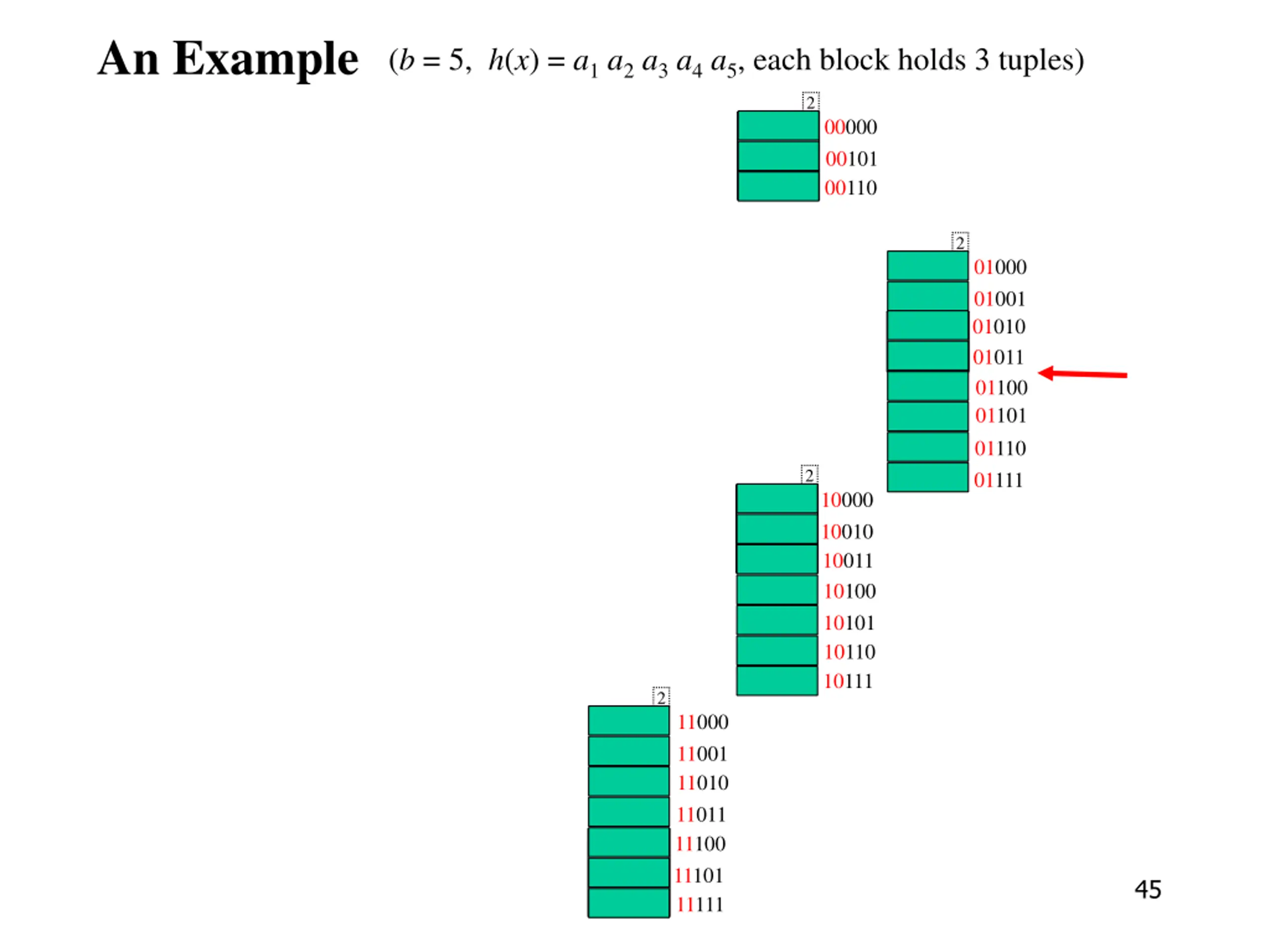 An Example (b = 5, h(x) = a1 a2 a3 a4 a5, each block holds 3 tuples) 2 00000 00101 00110 2 01000 01001 01010 01011 01100 01101 01110 2 01111 10000 10010 10011 10100 10101 10110 10111 2 11000 11001 11010 11011 11100 11101 11111 44