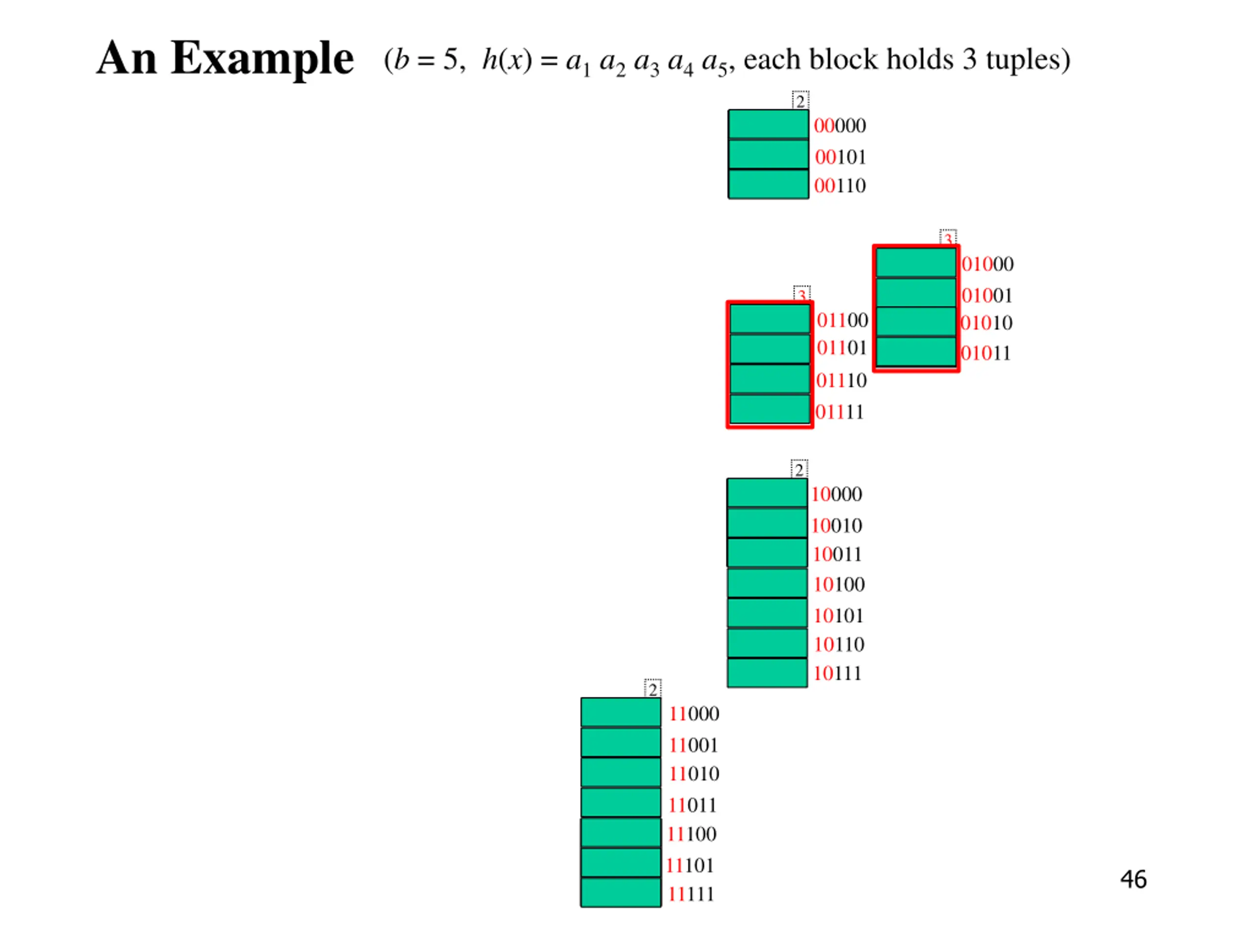 An Example (b = 5, h(x) = a1 a2 a3 a4 a5, each block holds 3 tuples) 2 00000 00101 00110 2 01000 01001 01010 01011 01100 01101 01110 2 01111 10000 10010 10011 10100 10101 10110 10111 2 11000 11001 11010 11011 11100 11101 11111 45