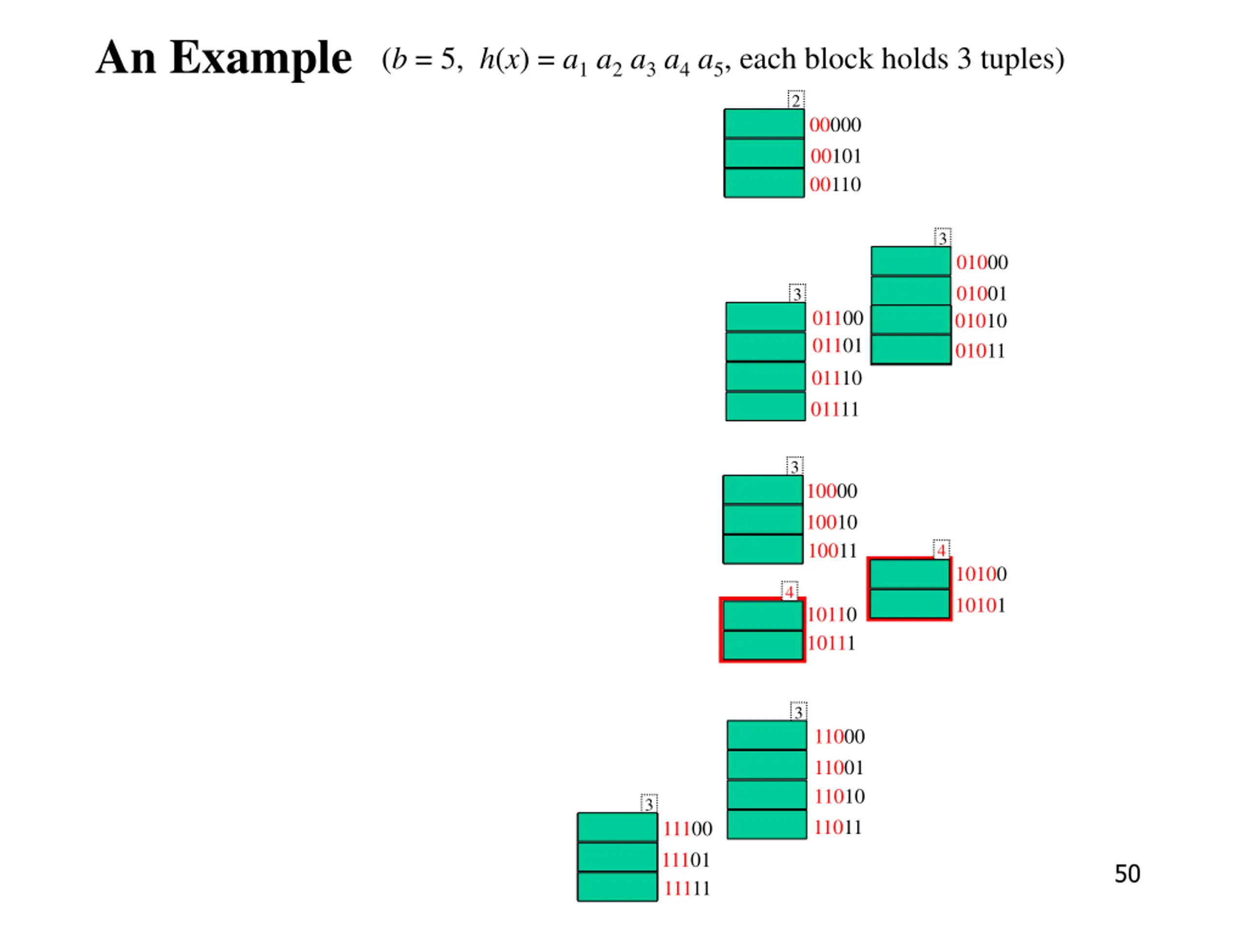 An Example (b = 5, h(x) = a1 a2 a3 a4 a5, each block holds 3 tuples) 2 00000 00101 00110 3 01000 01001 01010 01011 3 01100 01101 01110 01111 3 10000 10010 10011 3 10100 10101 10110 10111 3 11000 11001 11010 3 11011 11100 11101 11111 49