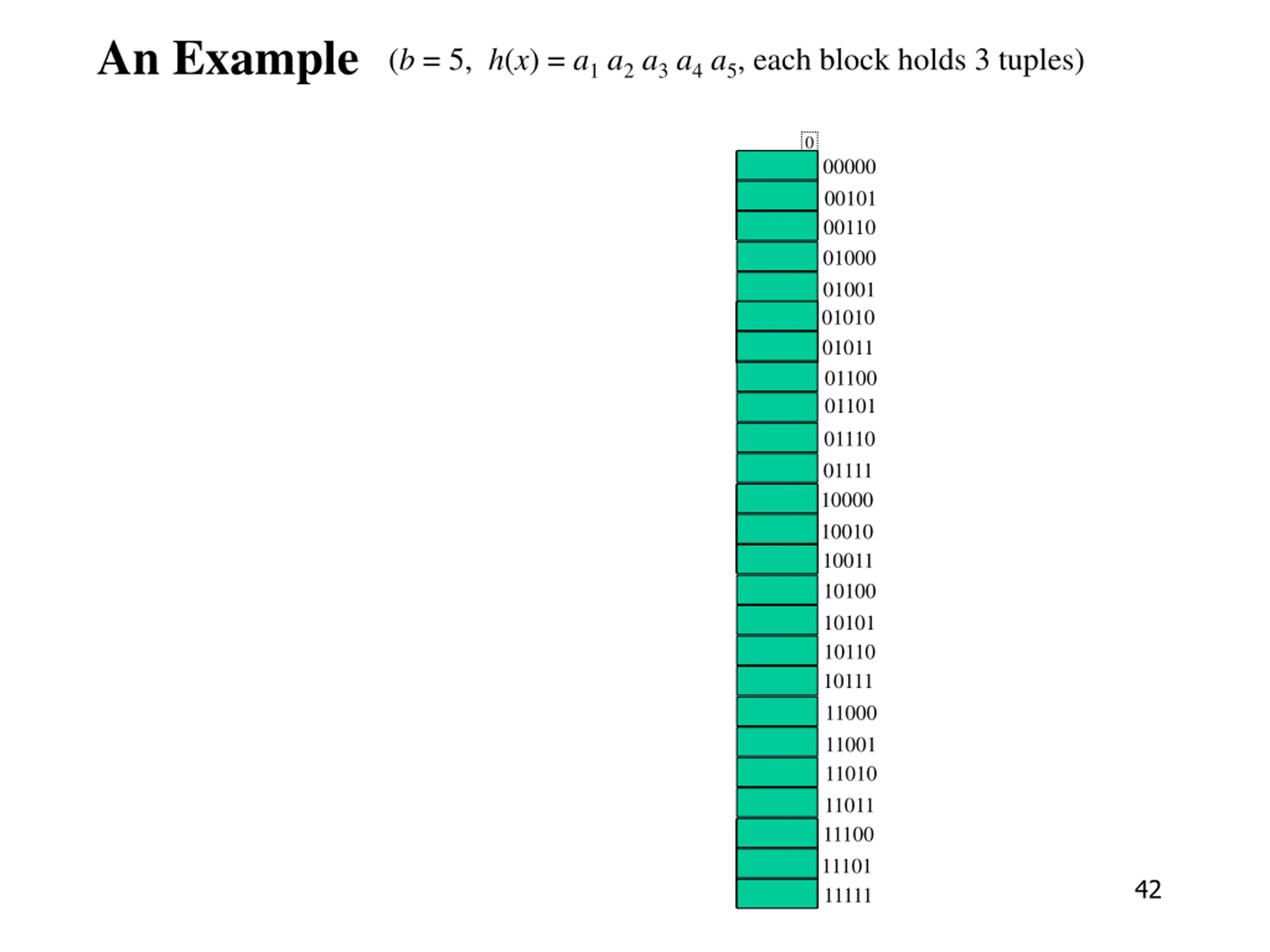 Constructing an Extensible Hashing for a Given Set S Input: A set S of elements, hash function h into b bits (b is large), 1. make S a group G0 with group index 0; \\ each group Gris associated with a unique string sr of r bits such that all \\ elements in Gr have their hash values with the first r bits equal to sr 2. WHILE there is a group Grthat cannot fit in a single block DO split Gr into two groups Gr+1and Gr+1 using the (r+1)st bit in the hash values of the elements; 3. FOR each group Gr DO put all elements in Gr into a block, with a block index r; 4. the largest block index is the hashing index i; i (1) (2) i 5. make a directory H[00 0 .. 11 1] of size 2i with H[k] pointing to the block for group Gr, if the first r bits of k is equal to the group string sr. 41