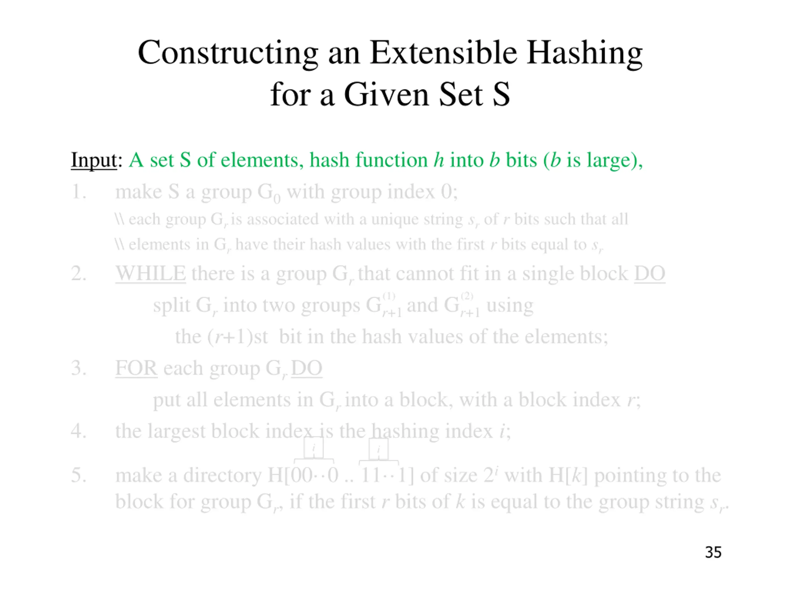 Constructing an Extensible Hashing for a Given Set S Input: A set S of elements, hash function h into b bits (b is large), 1. make S a group G0 with group index 0; \\ each group Gris associated with a unique string sr of r bits such that all \\ elements in Gr have their hash values with the first r bits equal to sr 2. WHILE there is a group Grthat cannot fit in a single block DO split Gr into two groups Gr+1and Gr+1 using the (r+1)st bit in the hash values of the elements; 3. FOR each group Gr DO put all elements in Gr into a block, with a block index r; 4. the largest block index is the hashing index i; i (1) (2) i 5. make a directory H[00 0 .. 11 1] of size 2i with H[k] pointing to the block for group Gr, if the first r bits of k is equal to the group string sr. 34