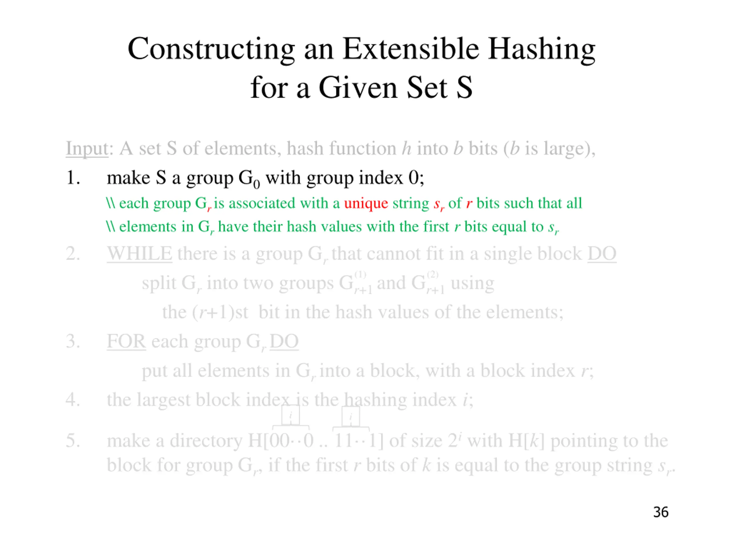 Constructing an Extensible Hashing for a Given Set S Input: A set S of elements, hash function h into b bits (b is large), 1. make S a group G0 with group index 0; \\ each group Gris associated with a unique string sr of r bits such that all \\ elements in Gr have their hash values with the first r bits equal to sr 2. WHILE there is a group Grthat cannot fit in a single block DO split Gr into two groups Gr+1and Gr+1 using the (r+1)st bit in the hash values of the elements; 3. FOR each group Gr DO put all elements in Gr into a block, with a block index r; 4. the largest block index is the hashing index i; i (1) (2) i 5. make a directory H[00 0 .. 11 1] of size 2i with H[k] pointing to the block for group Gr, if the first r bits of k is equal to the group string sr. 35
