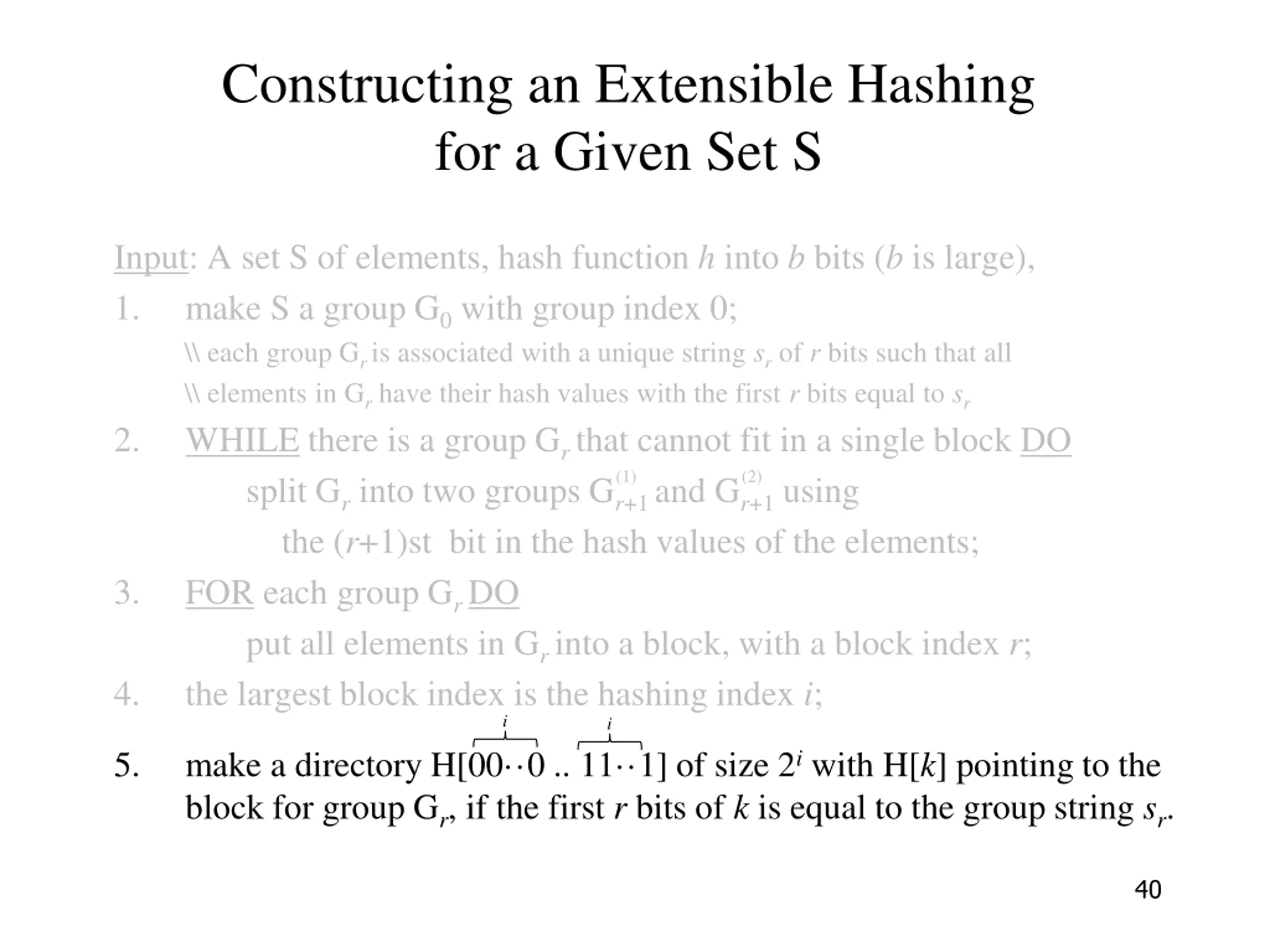 Constructing an Extensible Hashing for a Given Set S Input: A set S of elements, hash function h into b bits (b is large), 1. make S a group G0 with group index 0; \\ each group Gris associated with a unique string sr of r bits such that all \\ elements in Gr have their hash values with the first r bits equal to sr 2. WHILE there is a group Grthat cannot fit in a single block DO split Gr into two groups Gr+1and Gr+1 using the (r+1)st bit in the hash values of the elements; 3. FOR each group Gr DO put all elements in Gr into a block, with a block index r; 4. the largest block index is the hashing index i; i (1) (2) i 5. make a directory H[00 0 .. 11 1] of size 2i with H[k] pointing to the block for group Gr, if the first r bits of k is equal to the group string sr. 39