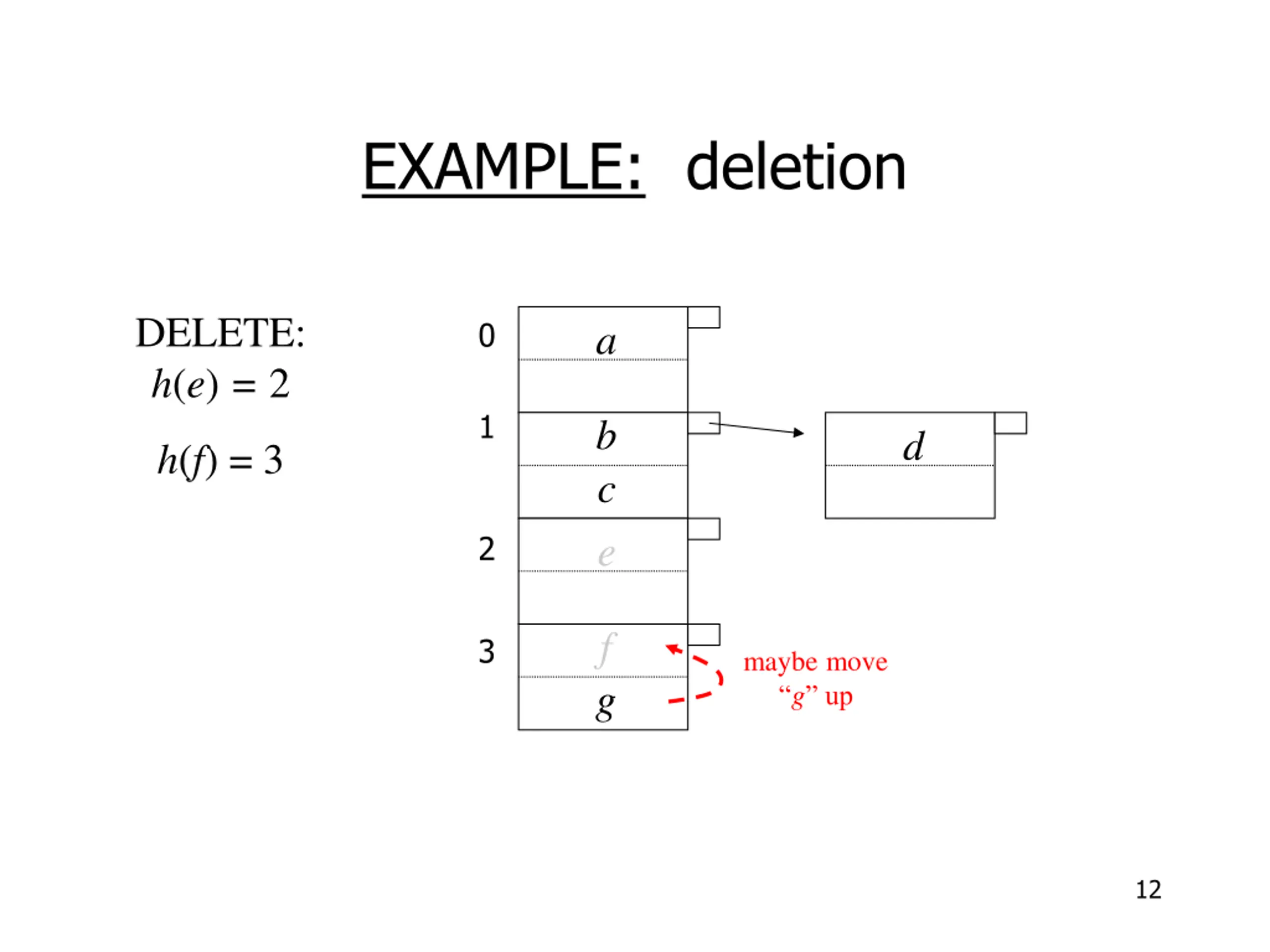 EXAMPLE: deletion DELETE: h(e) = 2 0 a 1 b c e d h(f) = 3 2 f g 3 11