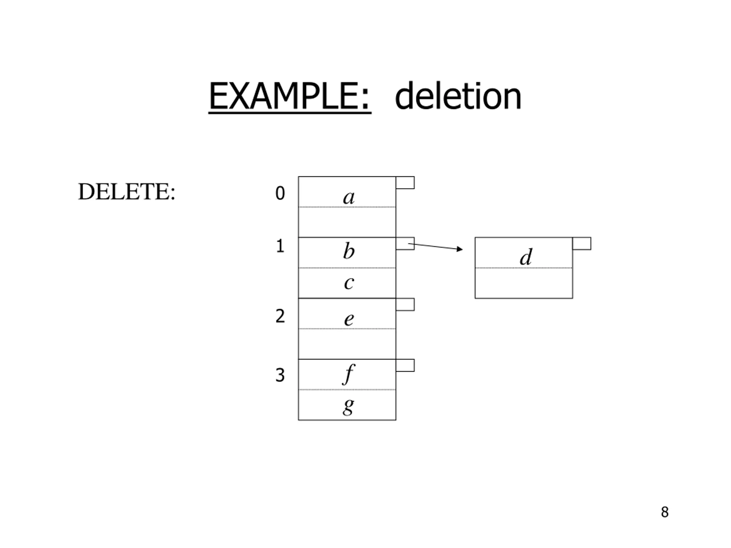 EXAMPLE: deletion DELETE: h(e) = 2 0 a 1 b c e d h(f) = 3 2 fg 3 13