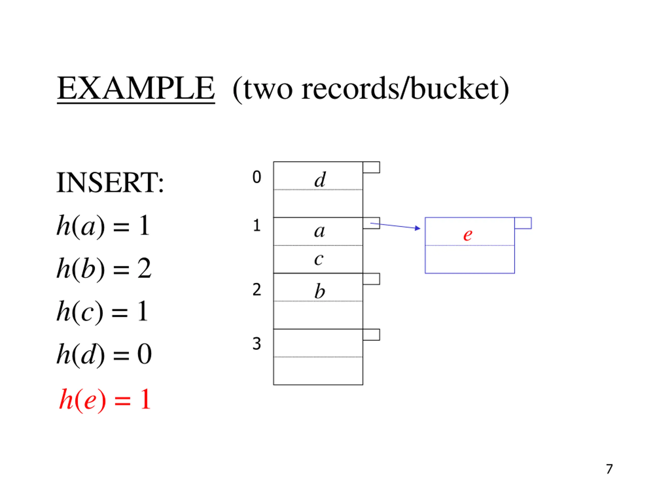 EXAMPLE (two records/bucket) INSERT: h(a) = 1 h(b) = 2 h(c) = 1 h(d) = 0 h(e) = 1 0 d 1 a c b e 2 3 7