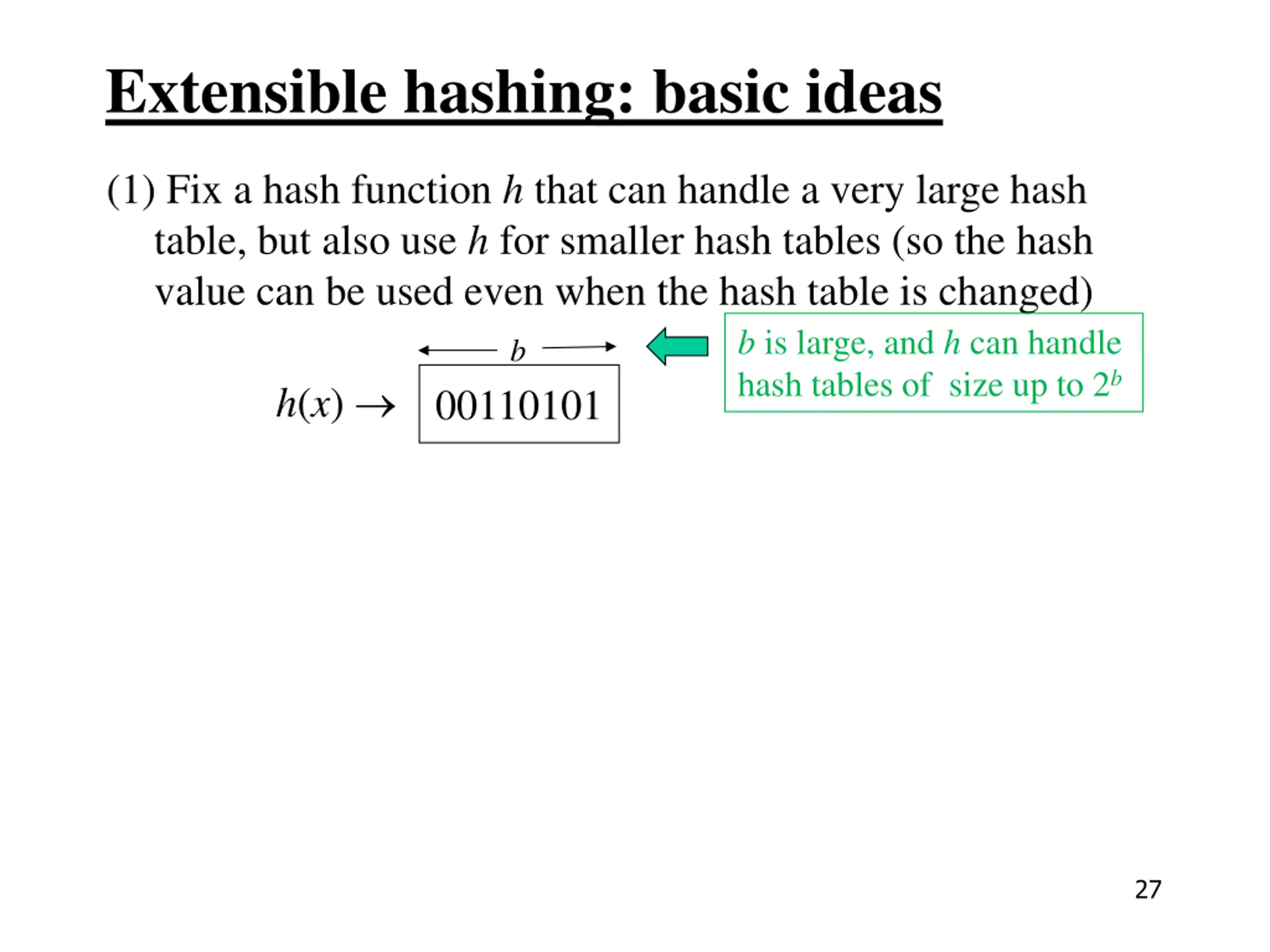 Extensible hashing: basic ideas (1) Fix a hash function h that can handle a very large hash table, but also use h for smaller hash tables (so the hash value can be used even when the hash table is changed) 26