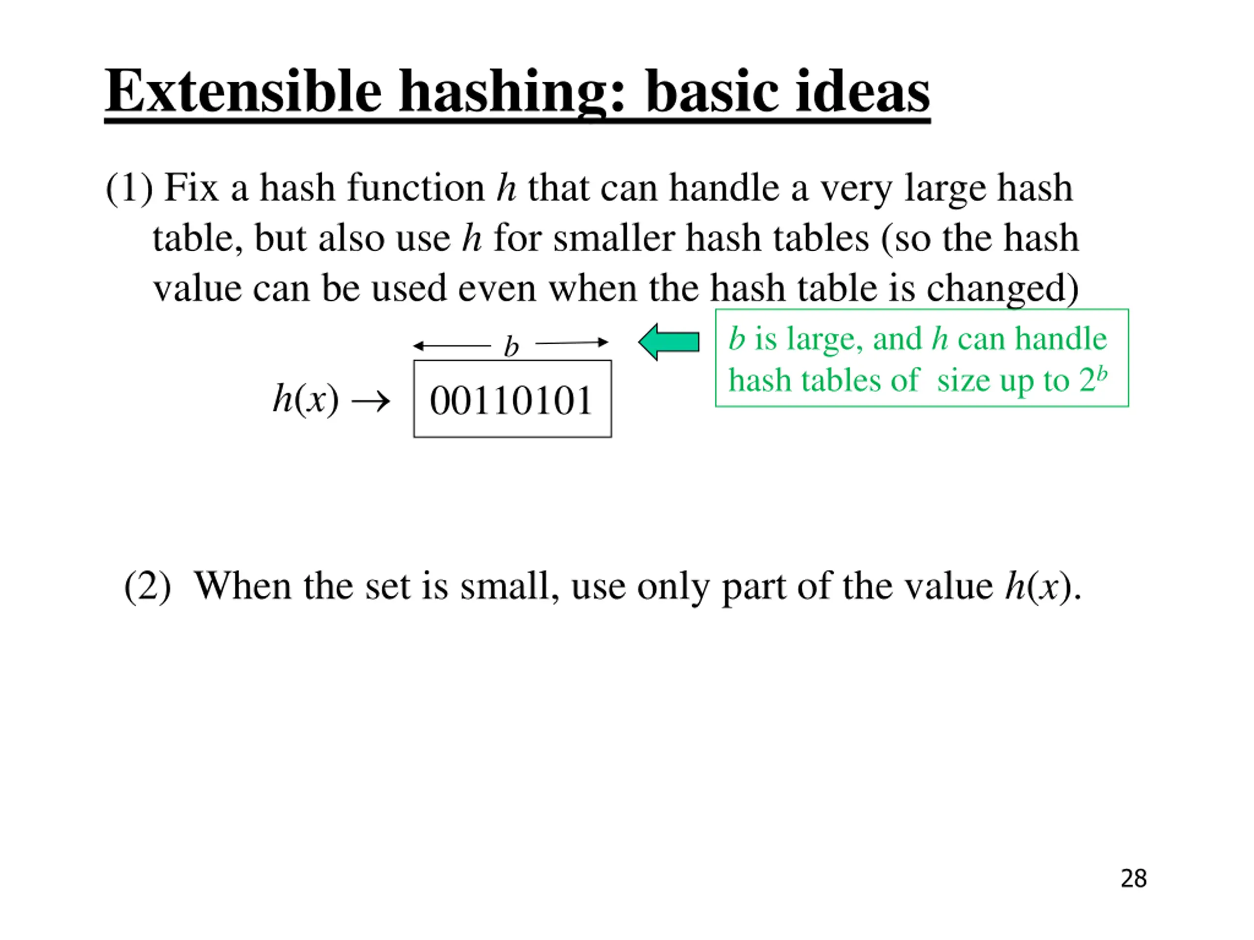 Extensible hashing: basic ideas (1) Fix a hash function h that can handle a very large hash table, but also use h for smaller hash tables (so the hash value can be used even when the hash table is changed) h(x) 00110101 b is large, and h can handle hash tables of size up to 2b b 27