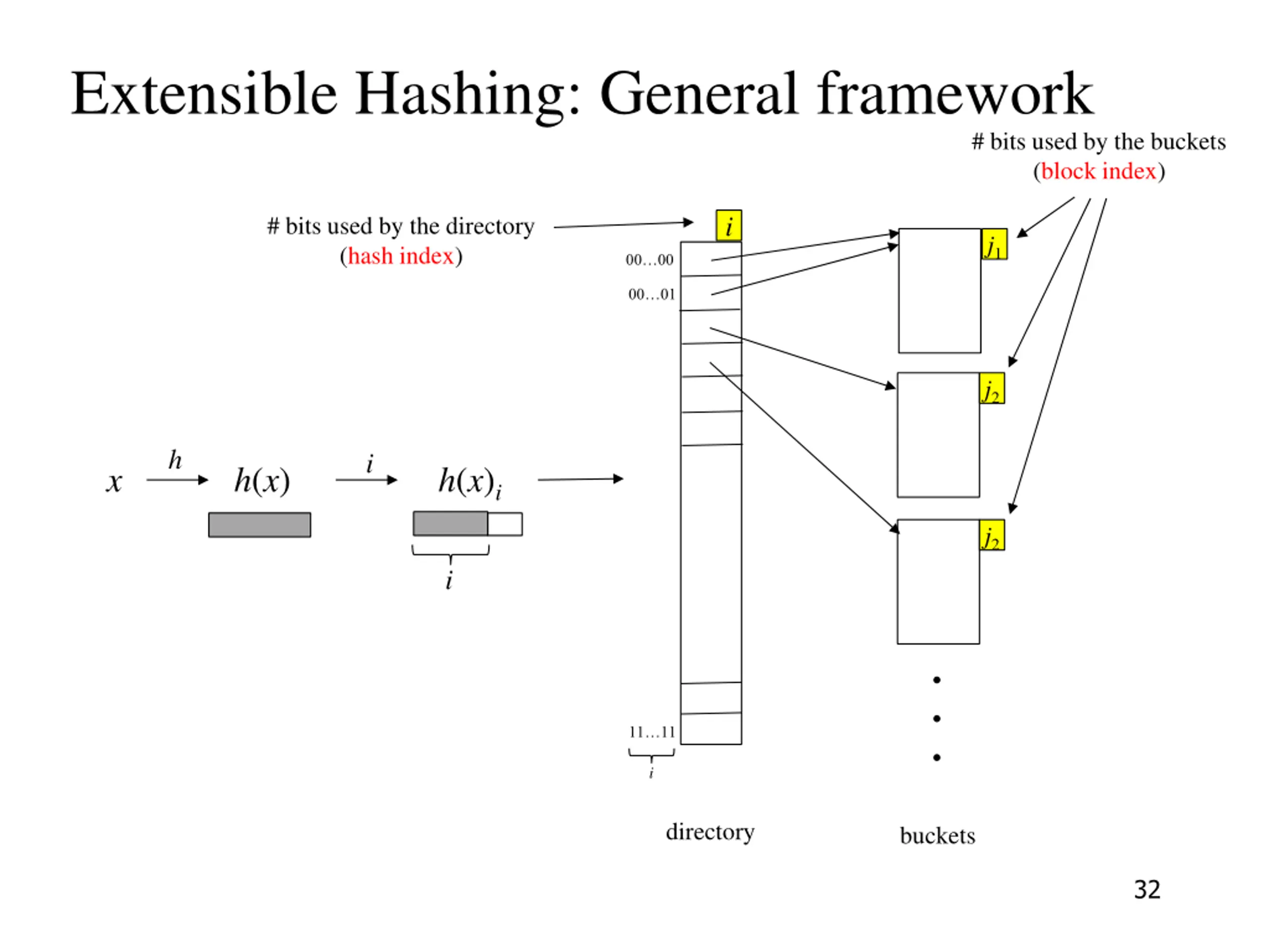Extensible Hashing: General framework # bits used by the buckets (block index) i # bits used by the directory (hash index) j1 00 00 00 01 j2 h i h(x) h(x)i x j2 i ... 11 11 i directory buckets 32