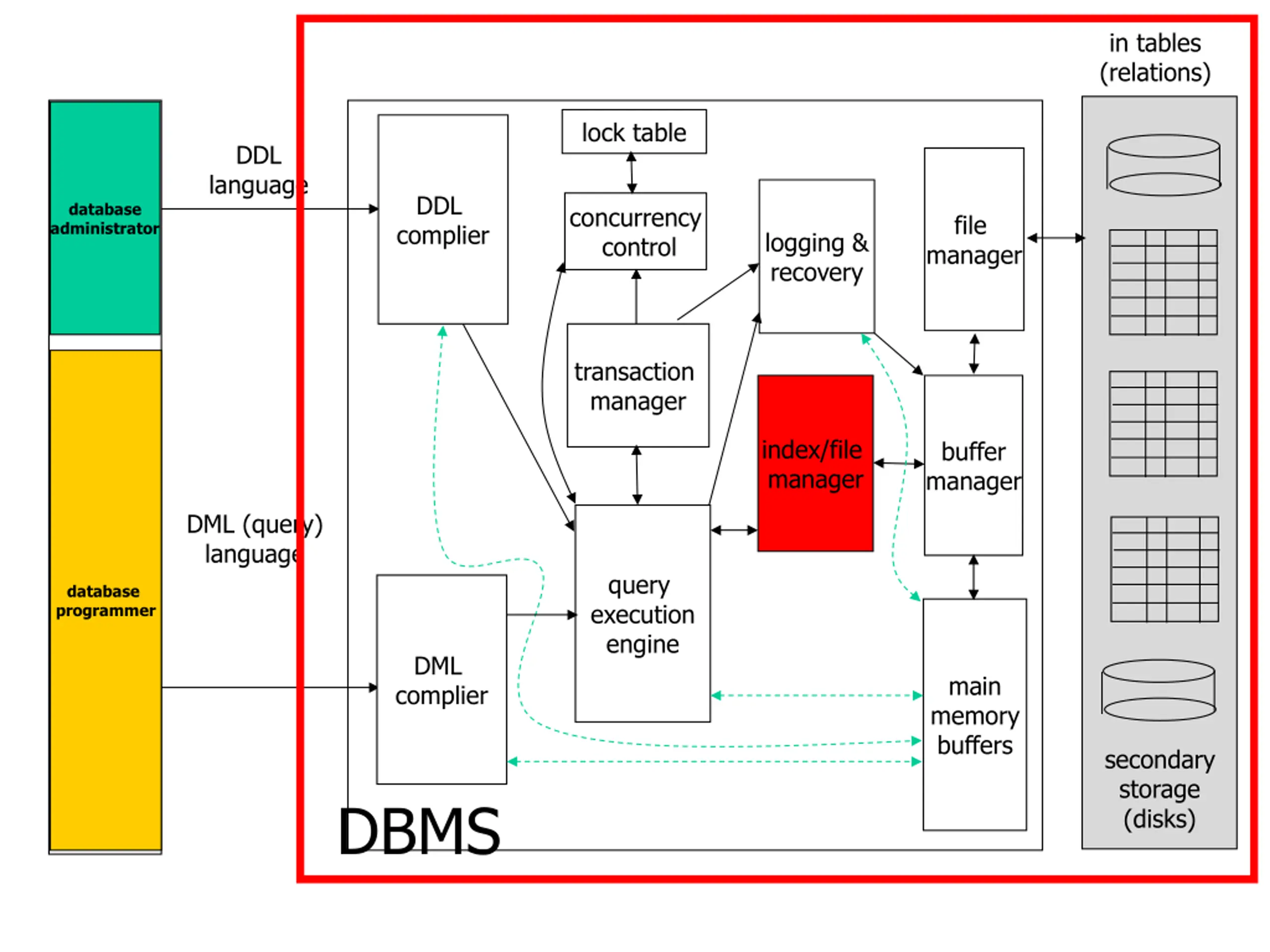 in tables (relations) lock table DDL language DDL complier database administrator concurrency control file logging & recovery manager transaction manager index/file manager buffer manager DML (query) language query execution engine database programmer DML complier main memory buffers secondary storage (disks) DBMS