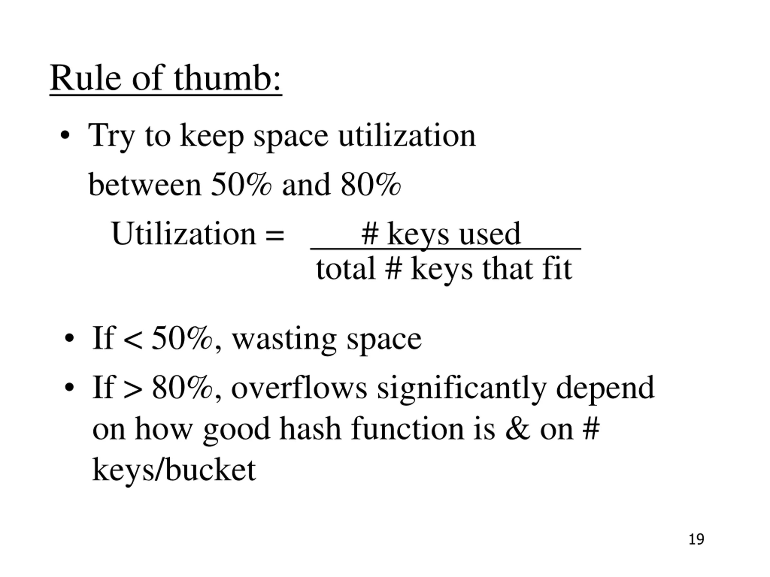 Rule of thumb: Try to keep space utilization between 50% and 80% Utilization = total # keys that fit # keys used . 18