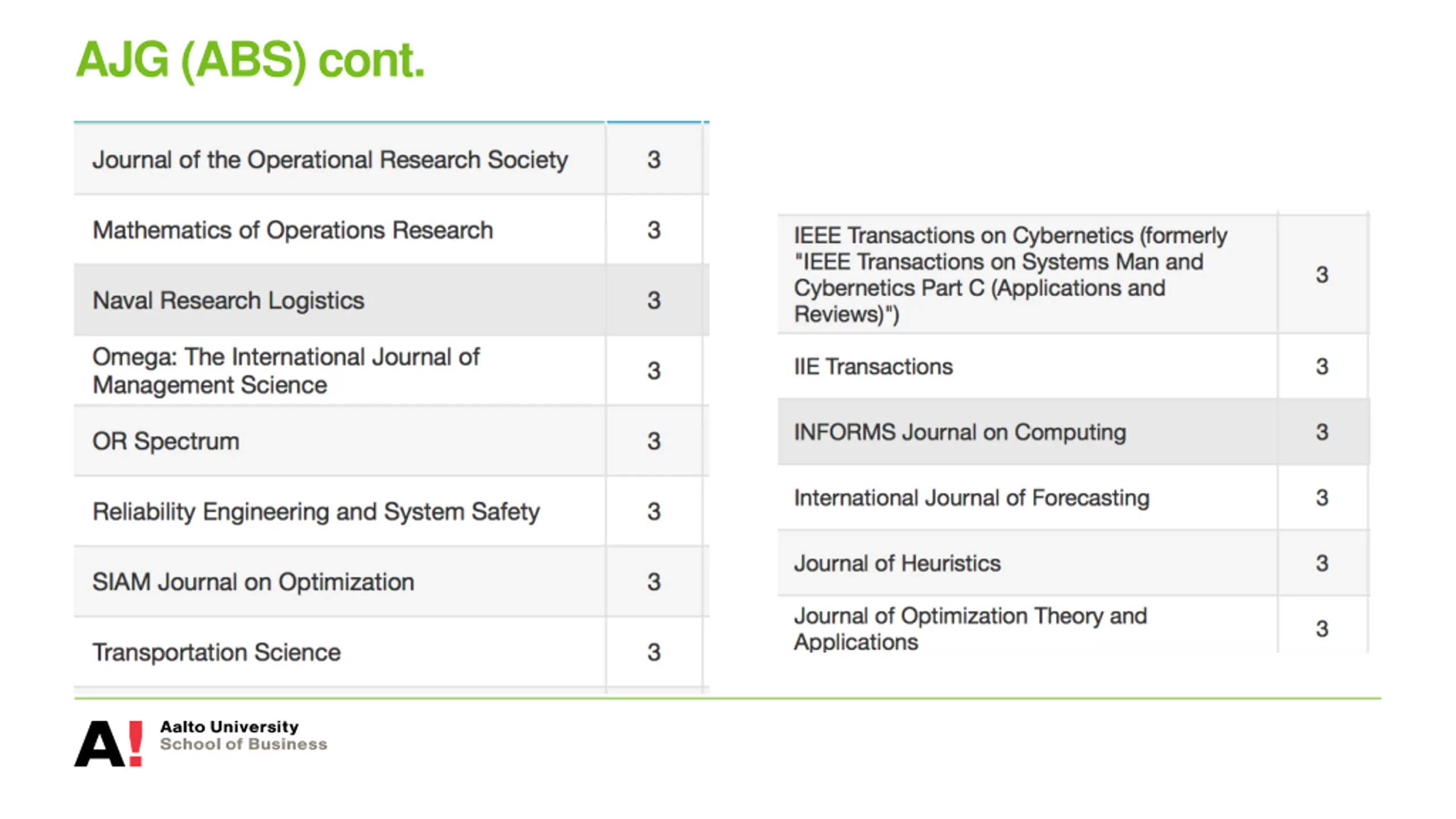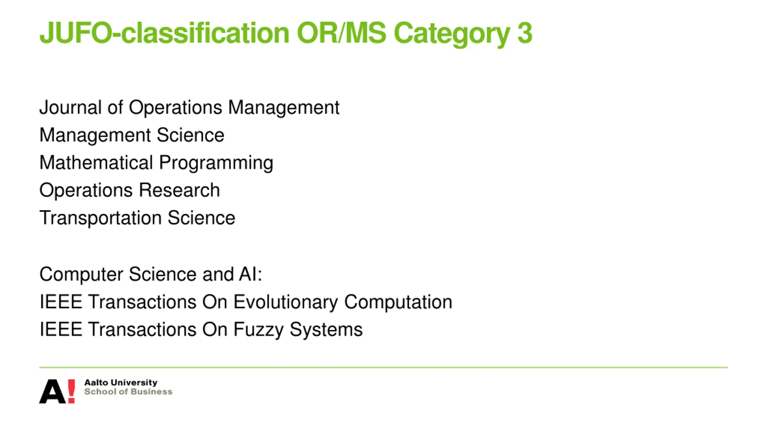 JUFO-classification OR/MS Category 3 Journal of Operations Management Management Science Mathematical Programming Operations Research Transportation Science Computer Science and AI: IEEE Transactions On Evolutionary Computation IEEE Transactions On Fuzzy Systems